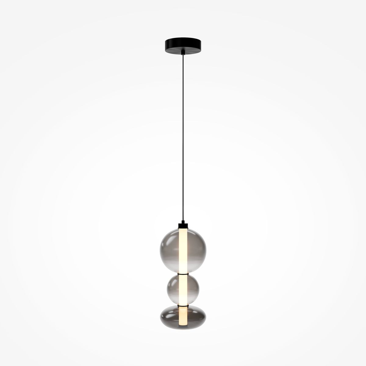 Светильники с тонированными выдувными стеклянными плафонами (дымчатыми  или янтарными) и металлической арматурой (черной или цвета латуни). Окрашивание плафонов градиентное. Источник света: LED. Световой элемент установлен внутри акрилового рассеивателя. Цветовая температура источника света – 3000К, угол рассеивания — 120°. Торшеры снабжены Push-кнопкой на проводе.