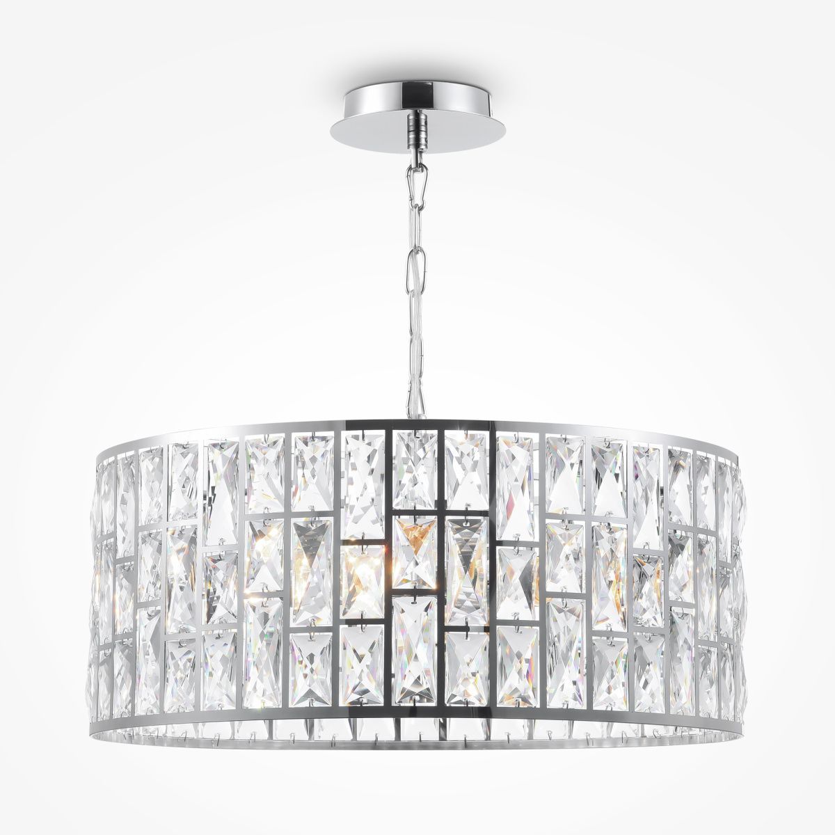 Металлическая арматура, цвет – хром. Каркас абажура – металл, декор – прозрач ный хрусталь. Потолочные модели с рассеивателем из матового стекла. Высота подвесных светильников регулируется.