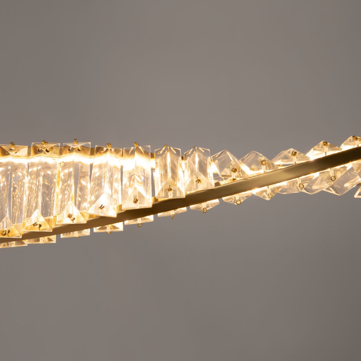 Металлическая арматура в золотом цвете. Асимметричный хрустальный декор. Трендовая форма окружности. LED-источник света с температурой 4000К. Высокий индекс цветопередачи 90Ra.
