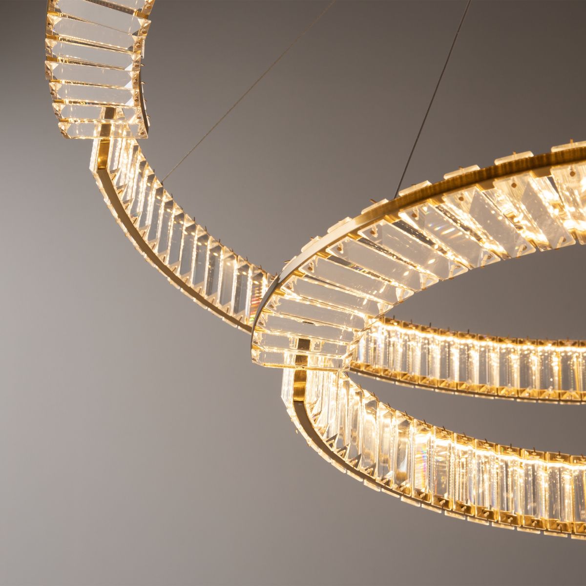 Металлическая арматура в золотом цвете. Асимметричный хрустальный декор. Трендовая форма окружности. LED-источник света с температурой 4000К. Высокий индекс цветопередачи 90Ra.