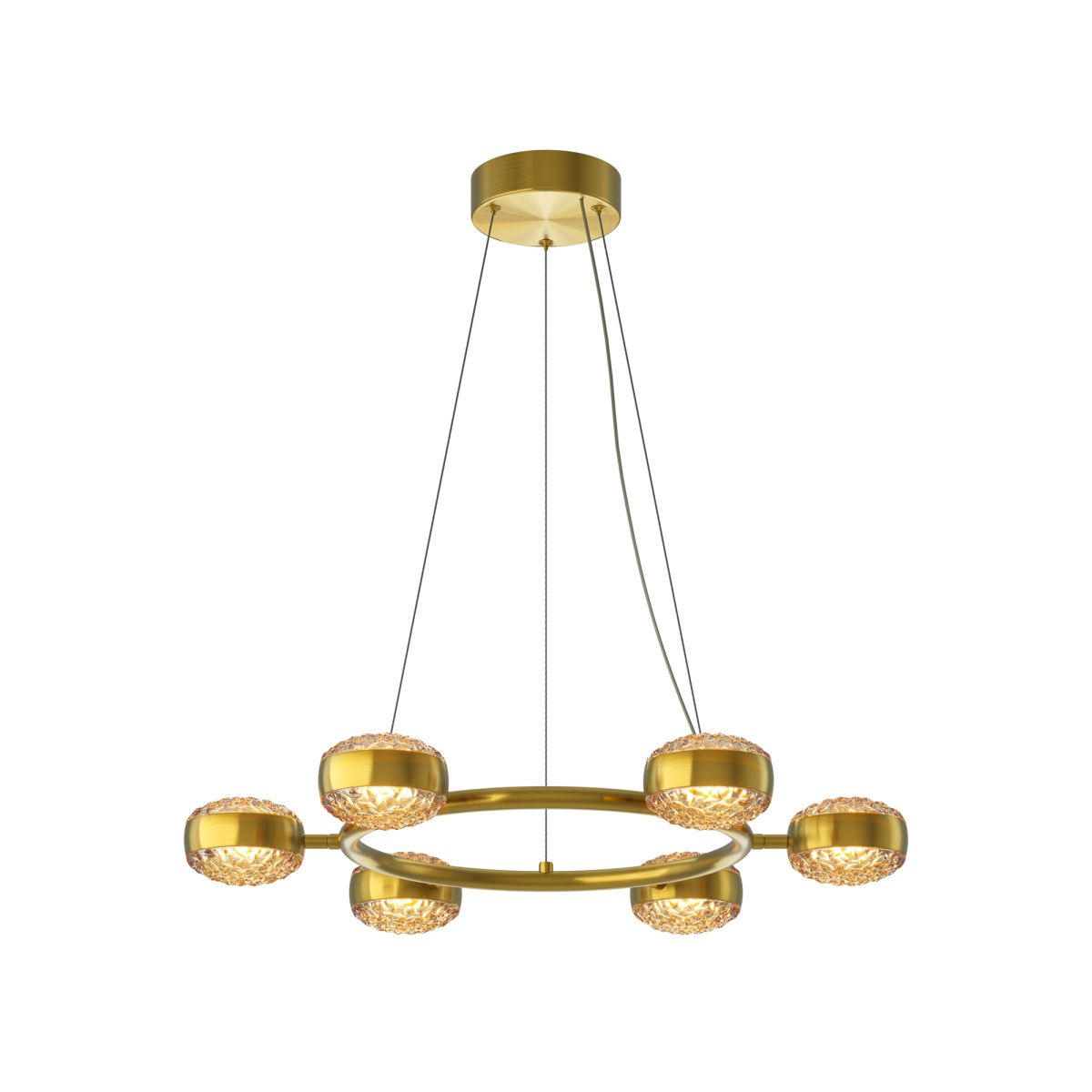 Два цветовых сочетания: сатинированная арматура из металла в цвете латунь в комбинации со стеклянными плафонами янтарного оттенка или  трендовый черный хром с глянцевым финишем в сочетании с тонированными светло-серыми плафонами. Источник света: LED. Цветовая температура 3000К, угол рассеивания 120 градусов. Провод длиной 3 м можно регулировать по высоте — светильник подходит для помещений с высокими потолками.