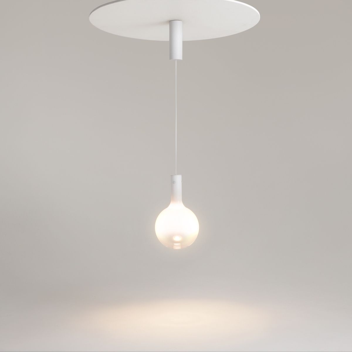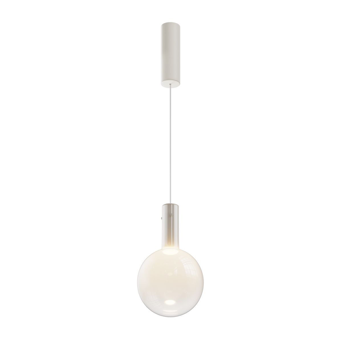 Металлическая арматура, цвет - черный, белый.  Выдувной плафон-шар из стекла с вытянутым цилиндрическим основанием в трех цветах: дымчато-черный, туманно-белый, бежево-коньячный. LED-источник света в основании плафона. Цветовая температура 3000К. Два диаметра плафонов и регулируемая длина проводов для создания разнообразных композиций.