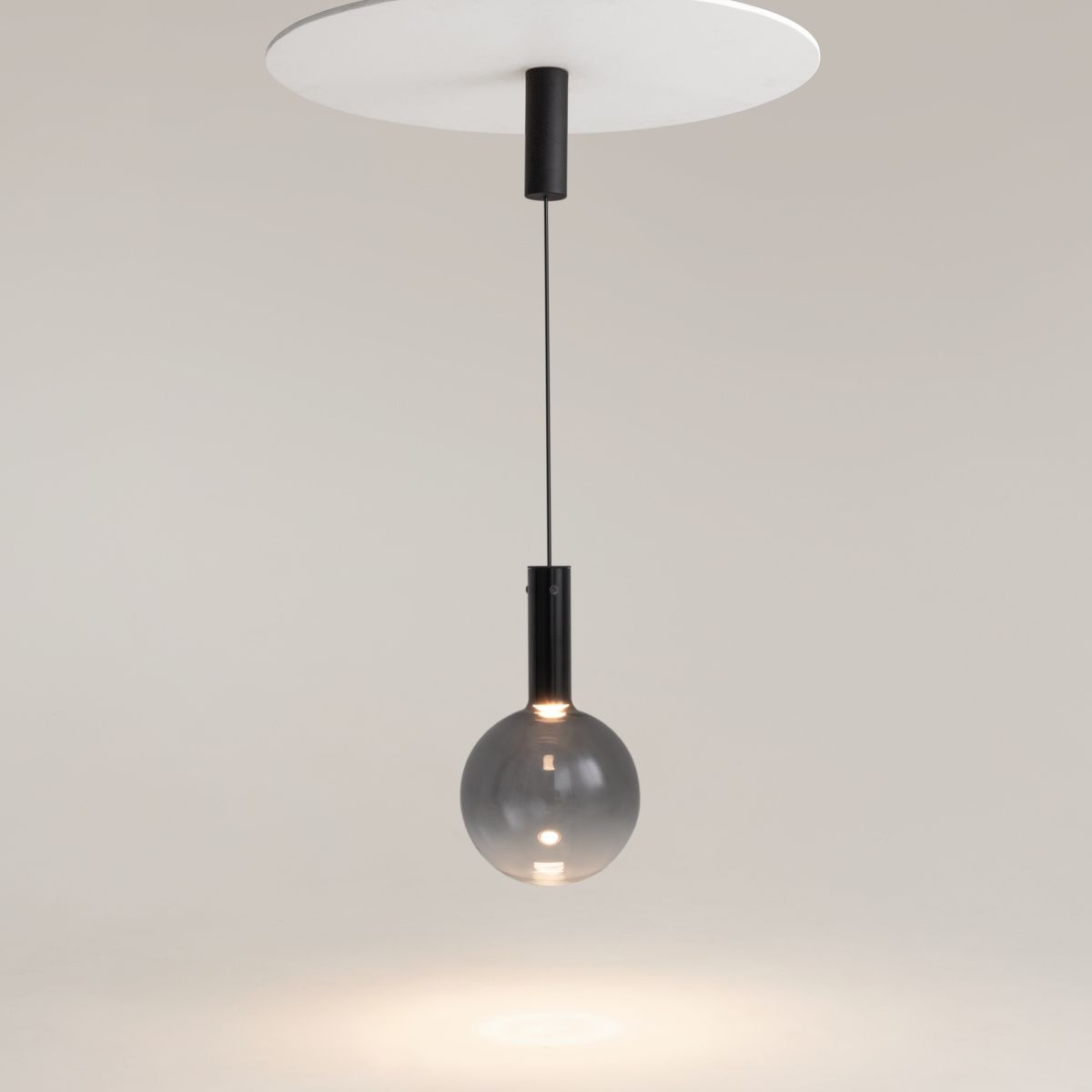 Металлическая арматура, цвет - черный, белый.  Выдувной плафон-шар из стекла с вытянутым цилиндрическим основанием в трех цветах: дымчато-черный, туманно-белый, бежево-коньячный. LED-источник света в основании плафона. Цветовая температура 3000К. Два диаметра плафонов и регулируемая длина проводов для создания разнообразных композиций.