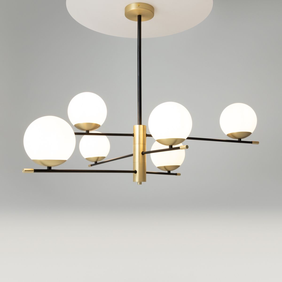 Арматура из металла в цвете матового золота. Плафоны-сферы из матового выдувного стекла. Модная асимметрия в дизайне. Источник света — лампы с цоколем Е14.