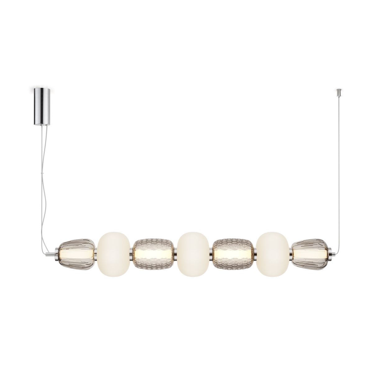 Металлическая арматура, цвет - золото, хром. Микс плафонов округлых и вытянутых форм из белого  матового и прозрачного стекла с сетчатым и с линейным повторяющимся рельефным рисунком. Регулируемая высота подвесных моделей, провод - 3 метра. LED-источник света, цветовая температура  3000К.