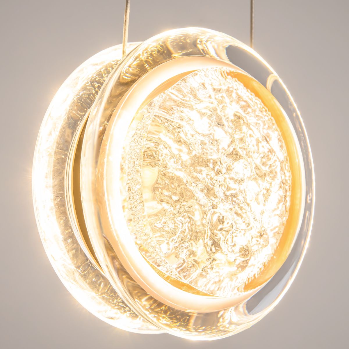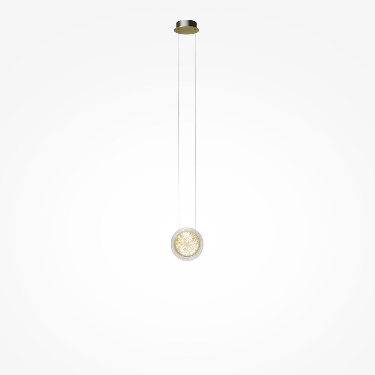 Арматура из металла цвета латунь с сатинированным финишным покрытием сочетается с прозрачными плафонами. Подвесные одинарные, горизонтальный и каскадные светильники оснащаются LED-модулем с двумя плоскими плафонами из акрила со сложным, актуальным паттерном на поверхности. Цветовая температура — 3000К, угол рассеивания — 125 градусов.