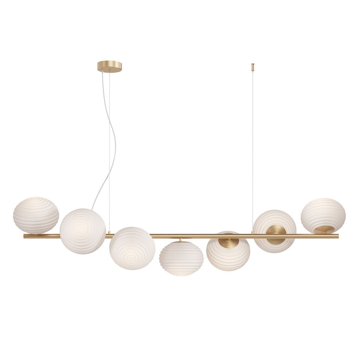 Материал арматуры - металл, цвета - черный, золото. «Динамичные» круглые плафоны со спиральным рельефом. Материал плафонов - стекло, цвета - белый матовый, глянцевый дымчатый. Провод 3  метра, длина регулируется. Источник света - лампы с цоколем Е14, Е27.