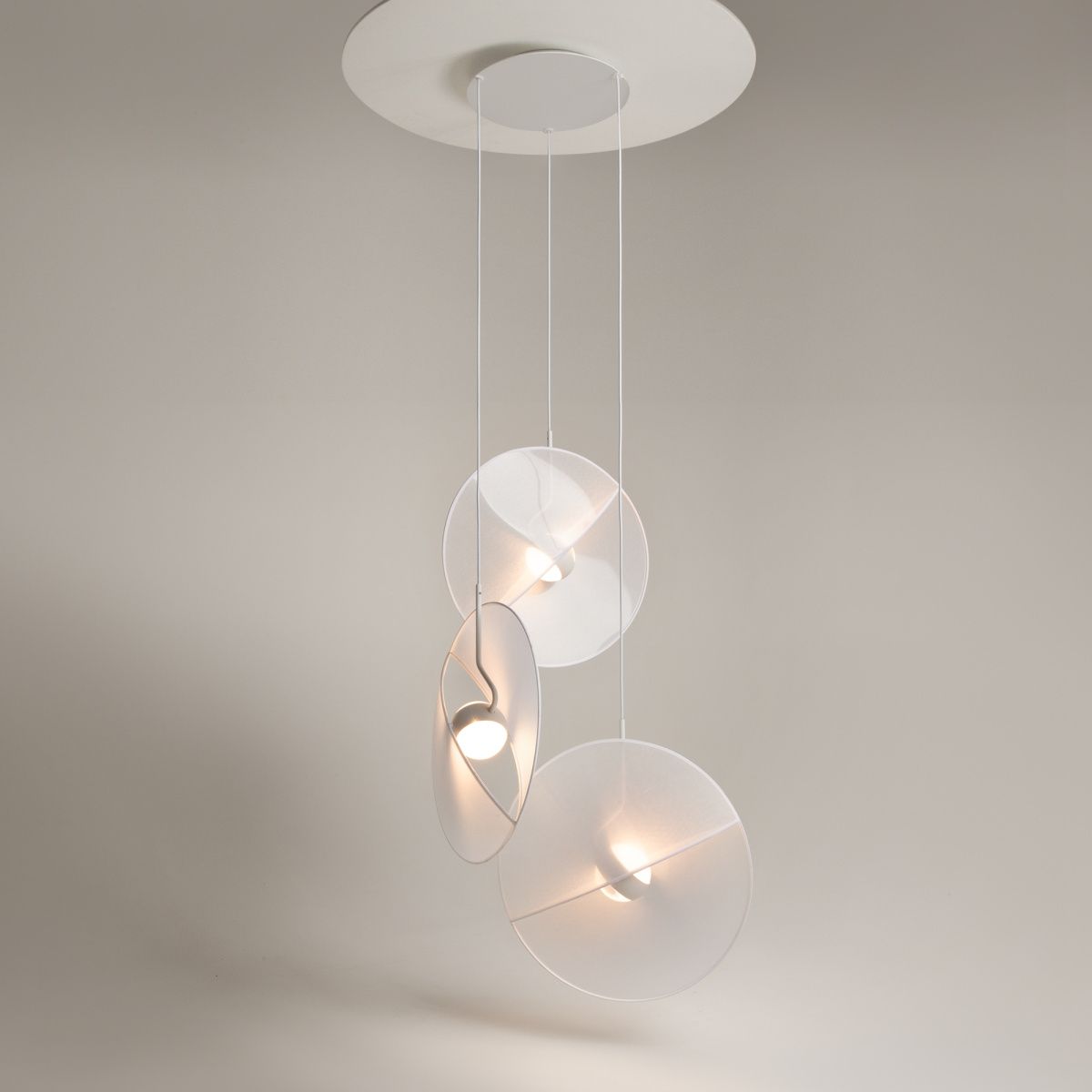 Арматура и плафон из металла и акрила. Цвет — белый. Декоративный светоотражающий элемент из полупрозрачной текстурированной ткани. Регулируемая высота. LED-источники света с цветовой температурой 3000К.