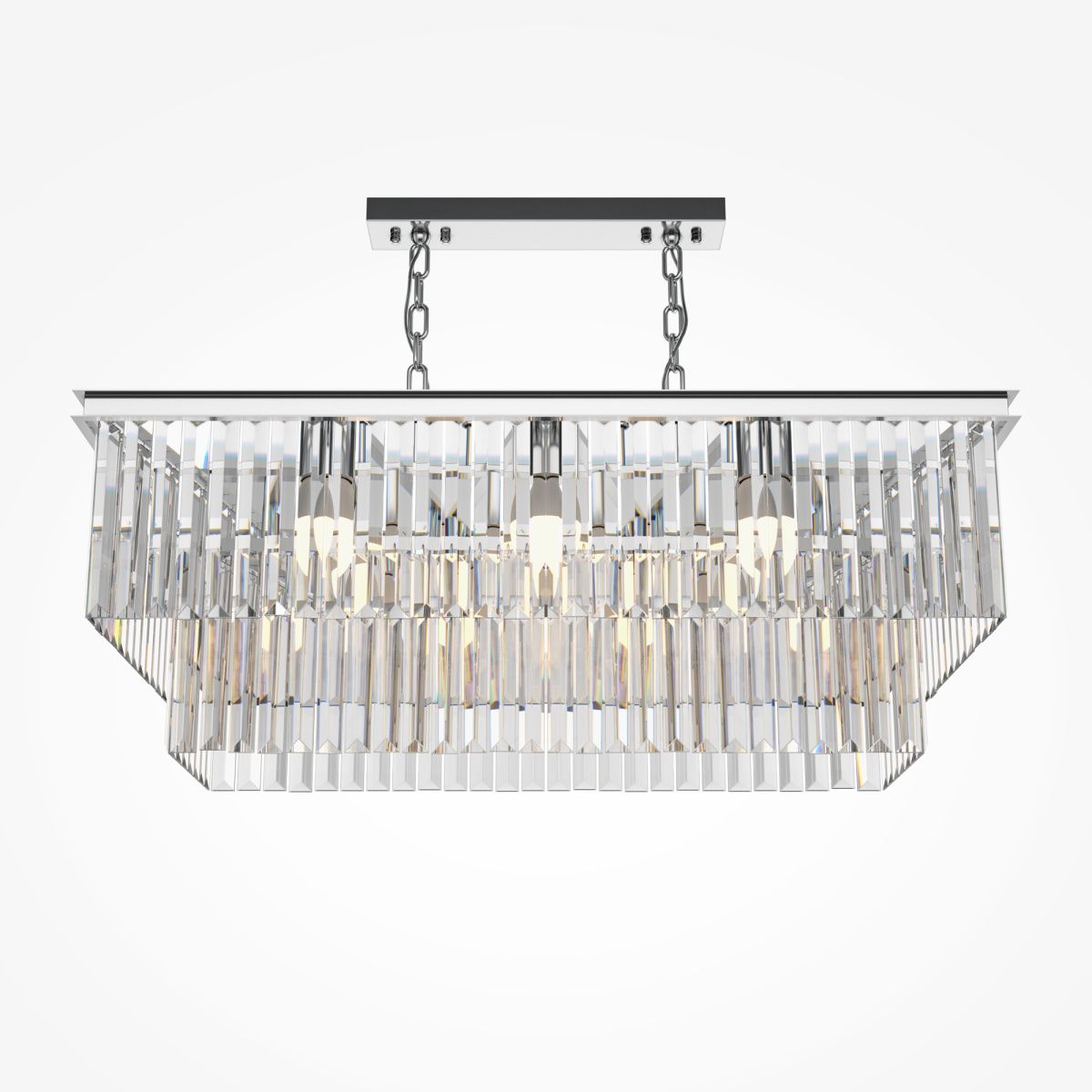 Арматура из металла в трех оттенках: латунь, хром, золото. Многоярусный декор. Подвески: прозрачное (арматура – хром, латунь) и янтарное (арматура – золото) стекло. Высота подвесных моделей регулируется.