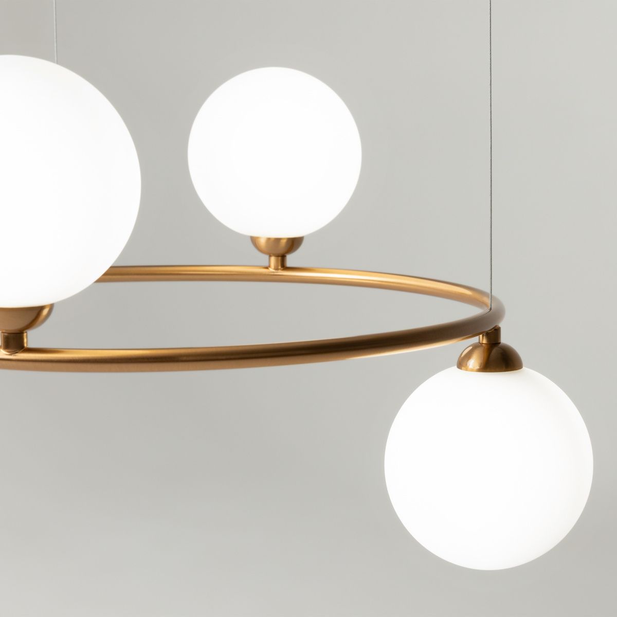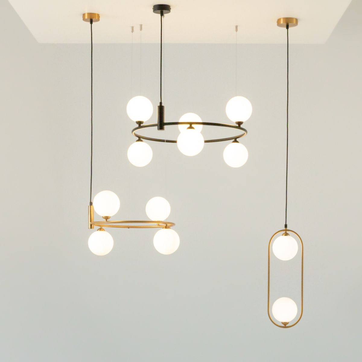 Арматура из металла в трех оттенках: белый, черный, латунь. Плафоны-сферы закреплены на округлом металлическом каркасе. Материал плафонов — выдувное стекло, цвет — белый. Высота подвесных моделей регулируется.