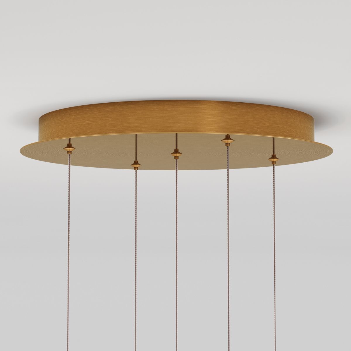 Цвет арматуры — латунь, плафоны из прозрачного акрила. Подвесной светильник с прочными и легкими плафонами из акрилового стекла снаб жен встроенным LED-источником света. LED-модуль дает теплый свет с цветовой температурой 3000К. Длина провода — 3 метра, ее можно  регулировать для установки в помещении с высокими потолками.