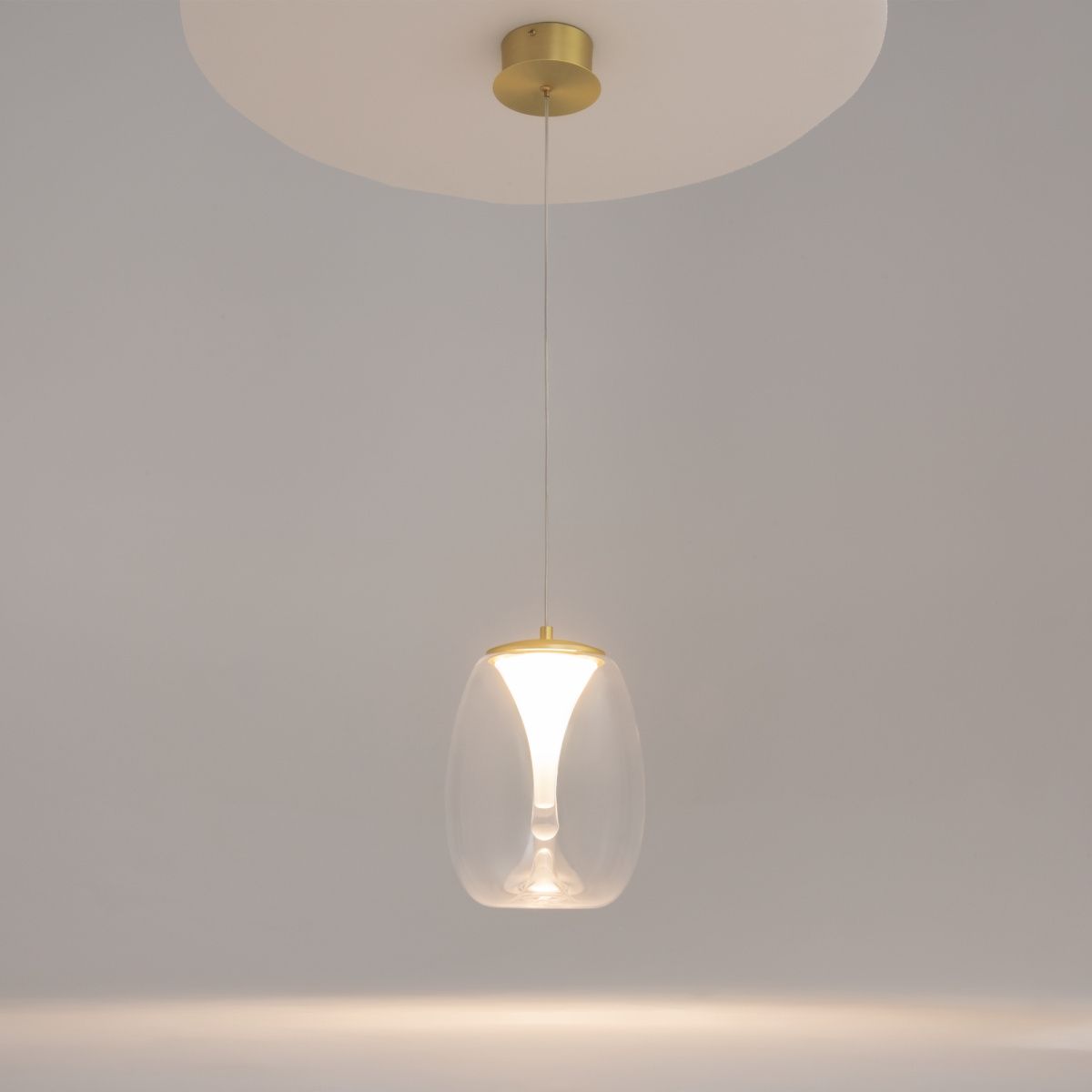 Цвет арматуры -  сатинированное золото.  Плафоны из двойного стекла.  Внешние плафоны  в двух  цветах: прозрачный и гальванизированный серый с эффектным градиентом - придают освещению глубину и насыщенность. LED источник света с цветовой  температурой 3000K. Провод подвесных светильников  регулируемый - длина 3  метра. Идеальны для помещений с высокими потолками.