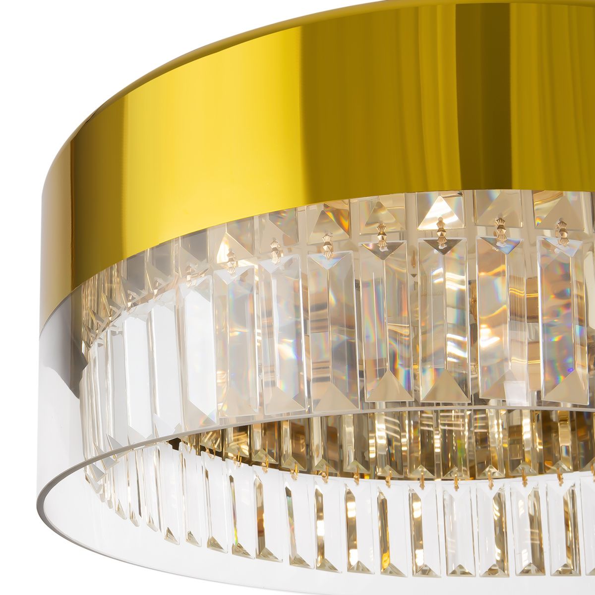 Арматура из нержавеющей стали в двух оттенках: хром, золото. Плафон из выду вного стекла, внутри – хрустальные подвесы. Часть плафона с зеркальным покры тием в тон арматуре. Цоколь Е14.
