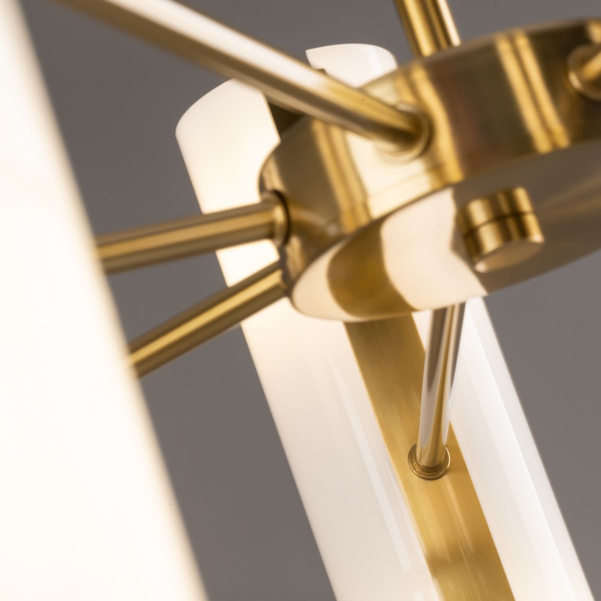Арматура — металлическая, цвет — латунь. Стеклянные белые плафоны-цилиндры мягко рассеивают свет в стороны. Открытые края плафонов и глянцевая поверхность дают дополнительный свет в вверх и вниз для максимальной освещенности. Источник света — лампа с цоколем Е14.