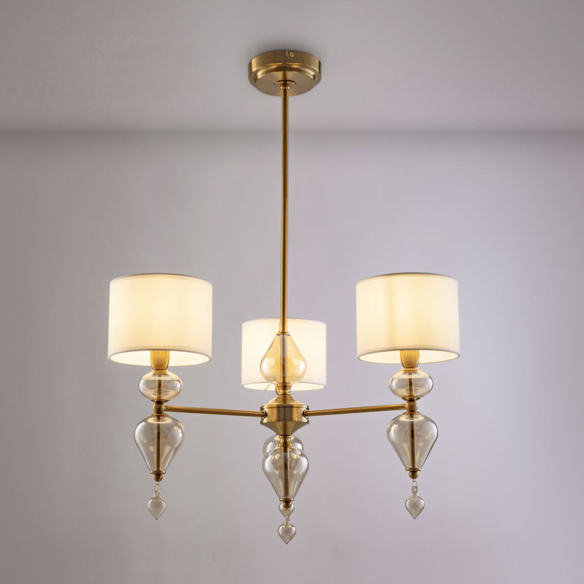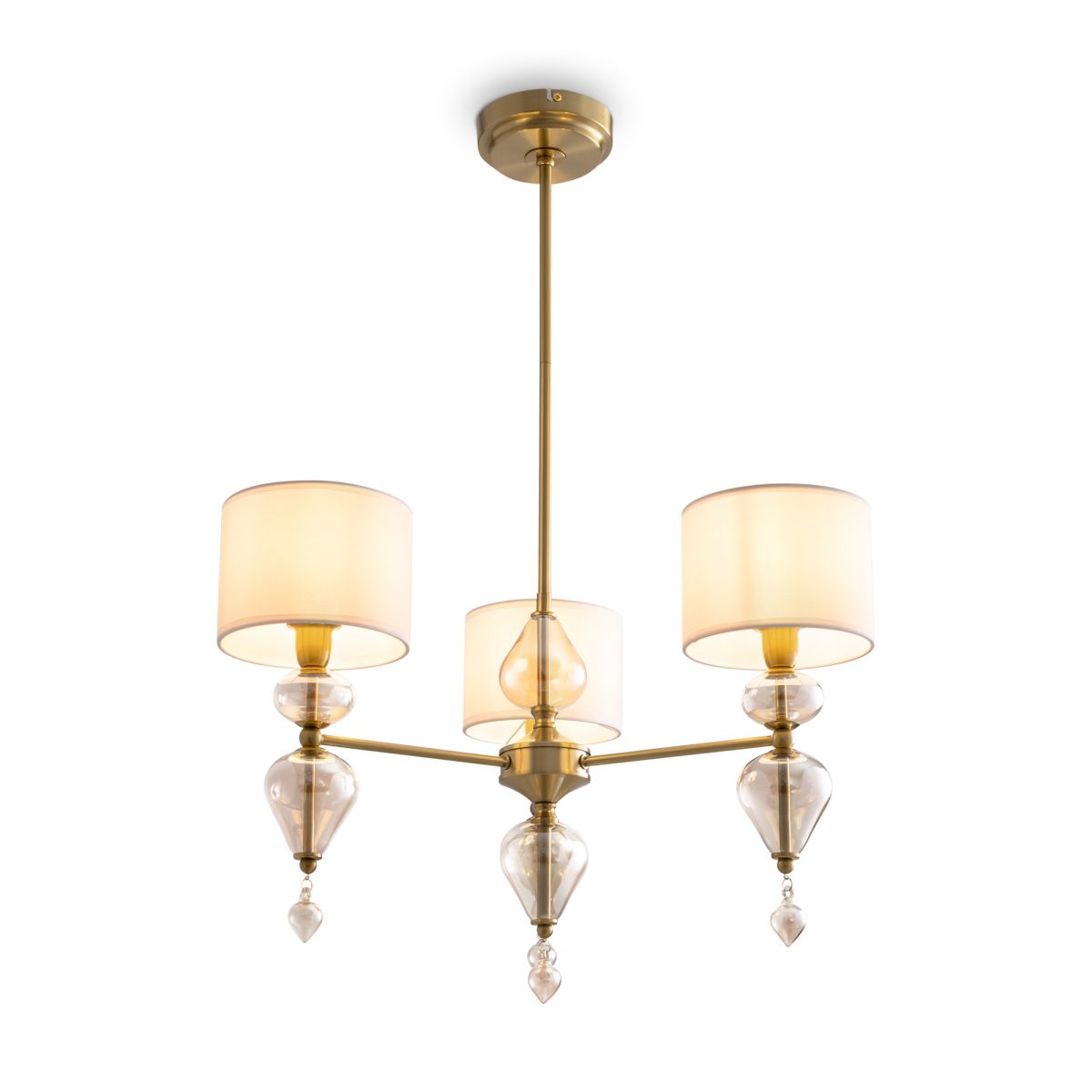 Арматура из металла, цвет — латунь. Плафоны — тканевые, молочного цвета. Металлическая конструкция декорирована выдувными стеклянными элементами с перламутровым напылением. Источником света служит лампа с цоколем Е14.