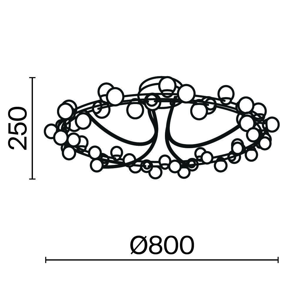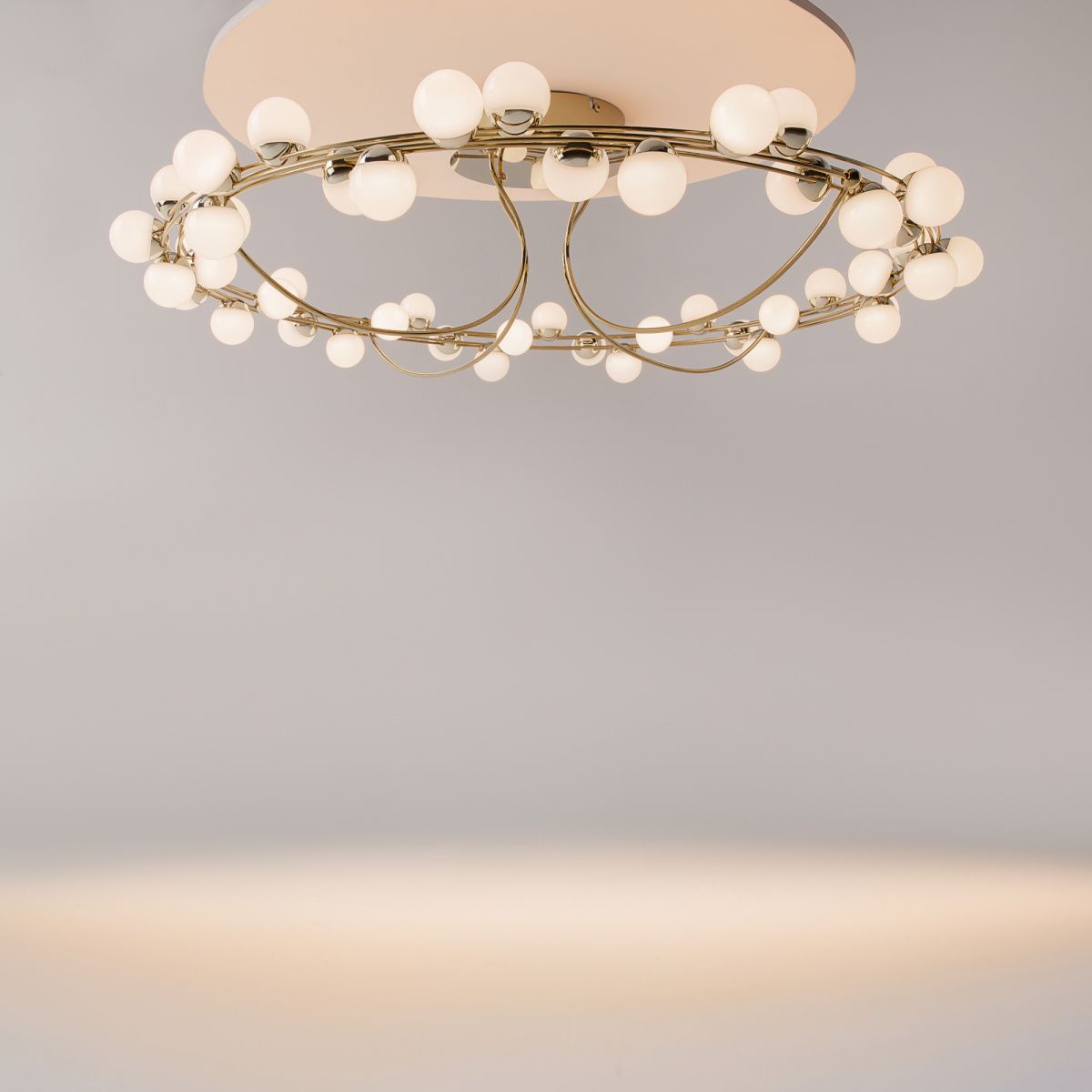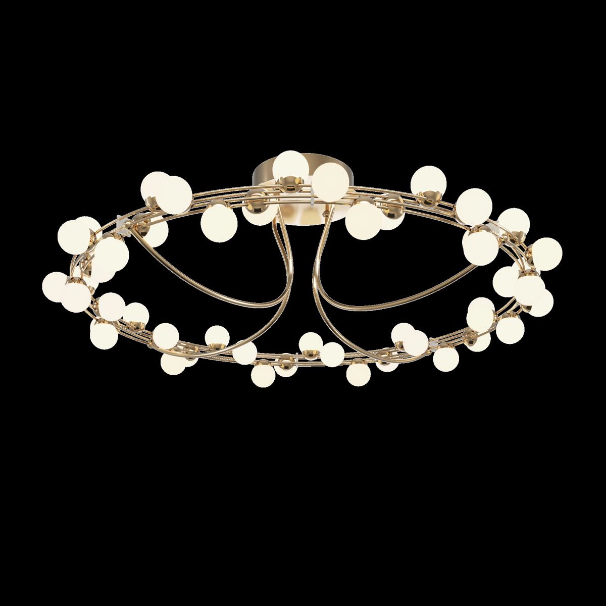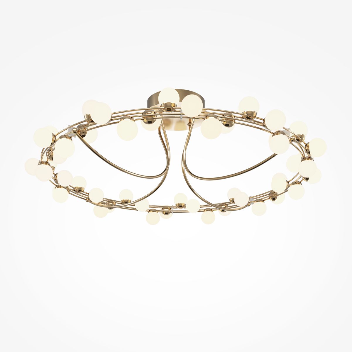 Арматура из металла в золотом цвете. Плафоны-сферы — белый пластик. Дизайн с имитацией молекулярной структуры. LED-источники света.