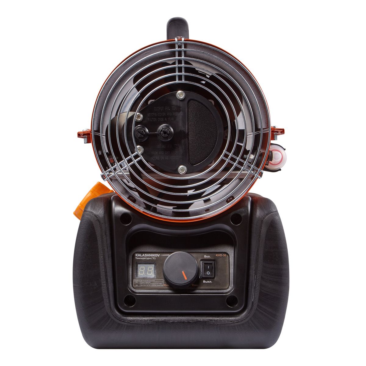 Безопасность использования дизельной тепловой пушки KALASHNIKOV KHD-30 обеспечивает электронная плата управления при помощи температурного датчика и фотоэлемента, контролирующего наличие пламени – прекращает работу прибора при возникновении аварийной ситуации.