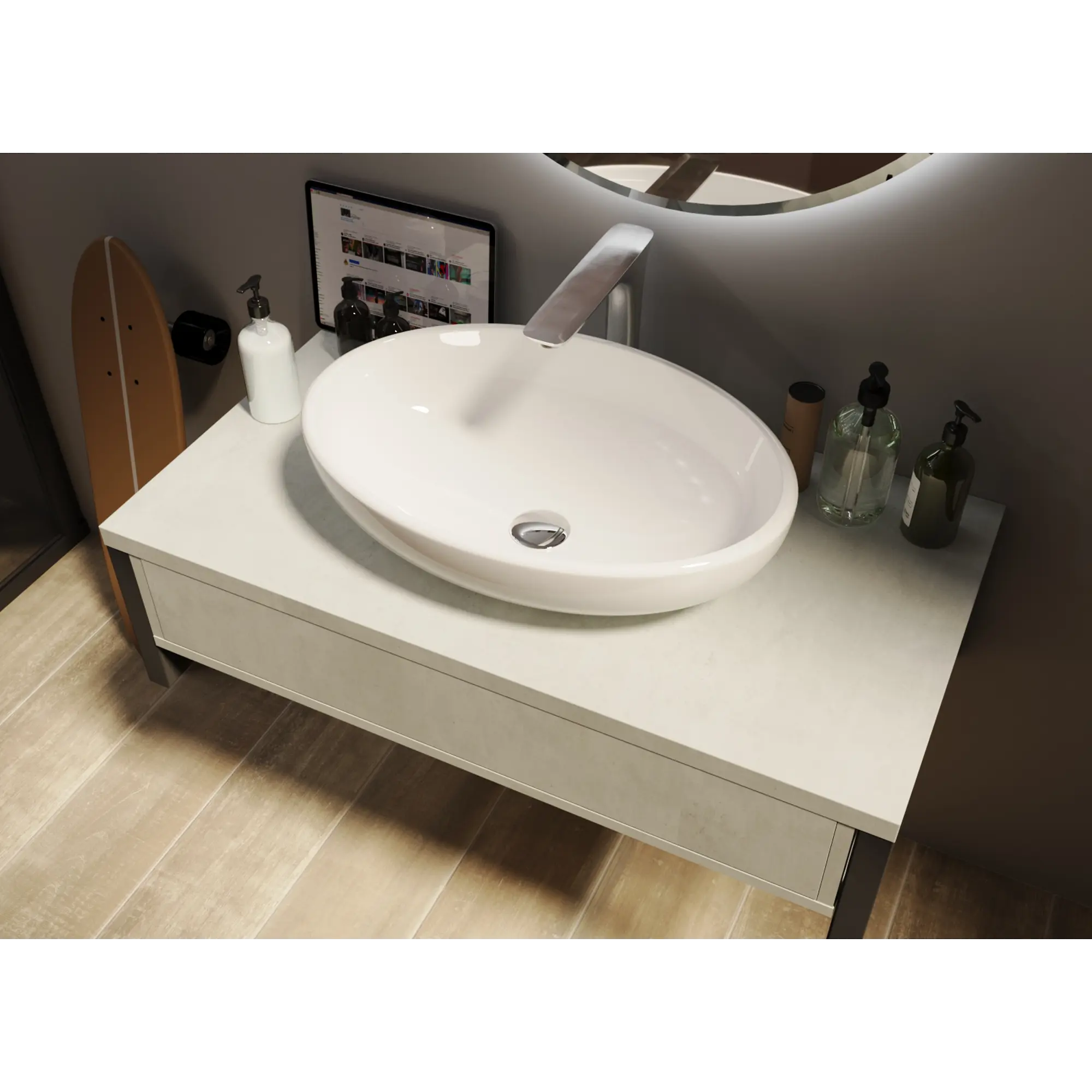 • Металлический каркас выдерживает нагрузку до 130 кг, включая накладную раковину. Крепления для кронштейна входят в комплект.
