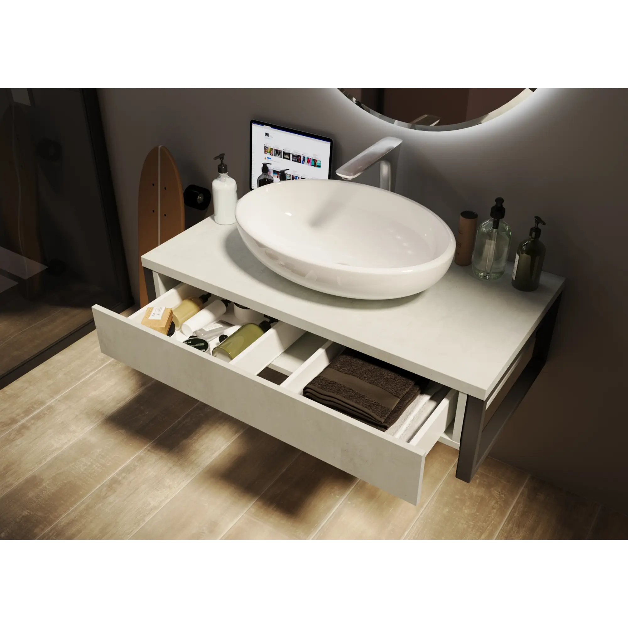 • Выдвижной механизм «push-to-open» из немецкой фурнитуры Hettich обеспечивает плавное закрытие ящика. Отсутствие классических ручек выглядит стильно. Внутренние отсеки удобны для хранения необходимых средств личной гигиены.
