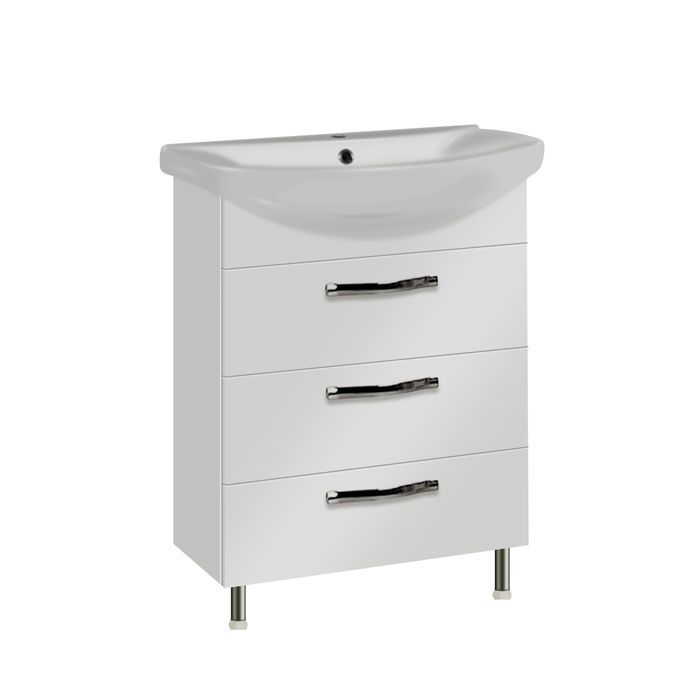 Напольная тумба устанавливается при помощи регулируемых по высоте ножек. В тумбе – три выдвижных ящика из влагостойкой ДСП в отделке «молочный дуб», верхний снабжен системой организации пространства. Ящики установлены на направляющие полного выдвижения немецкого производителя Blum, благодаря чему ими удобно пользоваться даже с керамической раковиной, выступающей вперед.