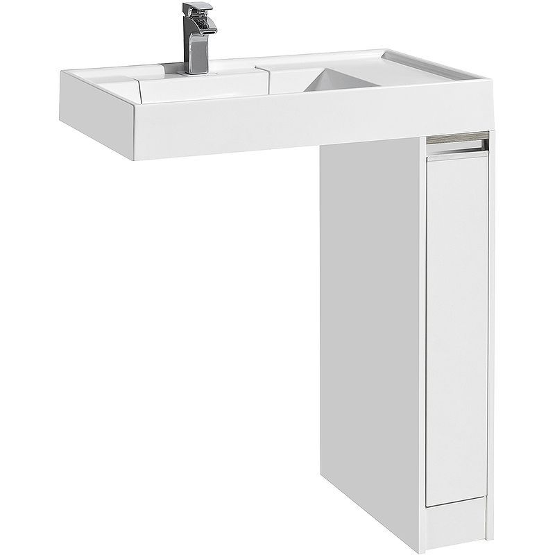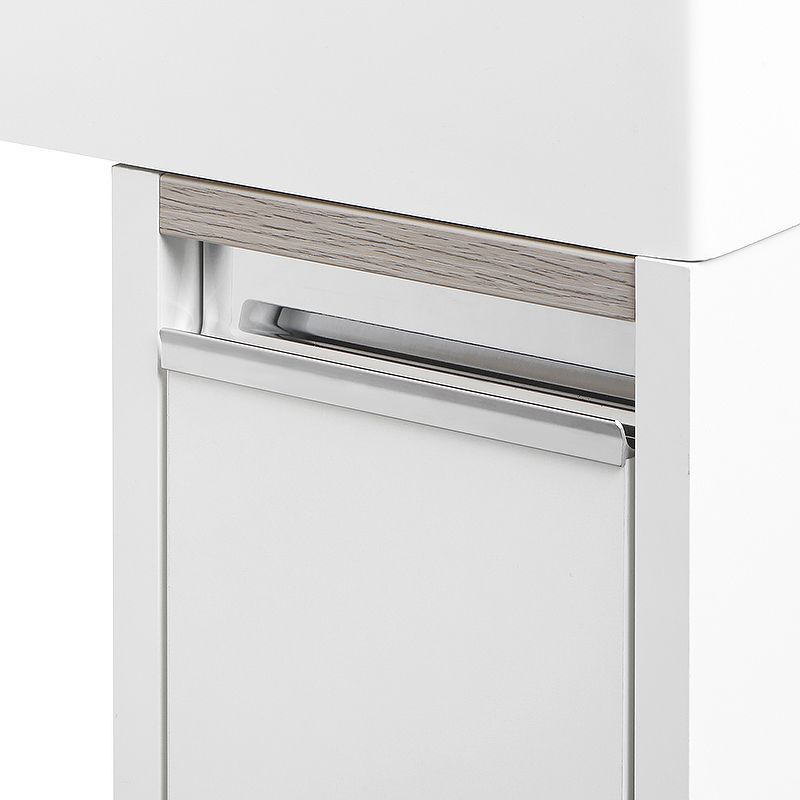 Ящик открывается с помощью изящной профильной хромированной ручки и состоит из двух отделений: верхнего и нижнего. Каждое отделение ящика выдерживает нагрузку до 20 кг. Над ручкой установлена вставка из влагостойкой ламинированной плиты благородного цвета дуб наварра.