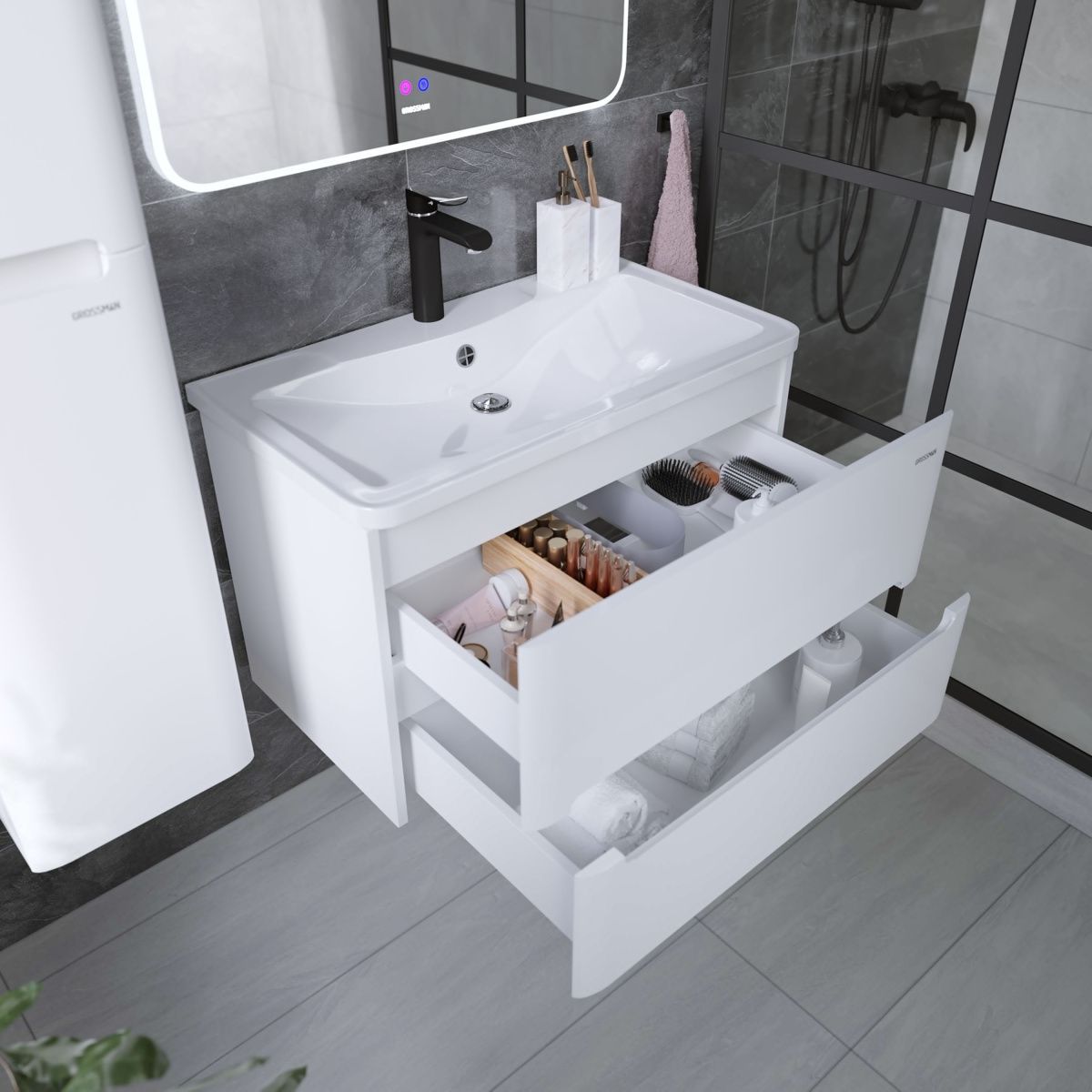 Тумба снабжена двумя ящиками, которые укомплектованы направляющими плавного закрывания, ящики предназначены для хранения различных предметов.