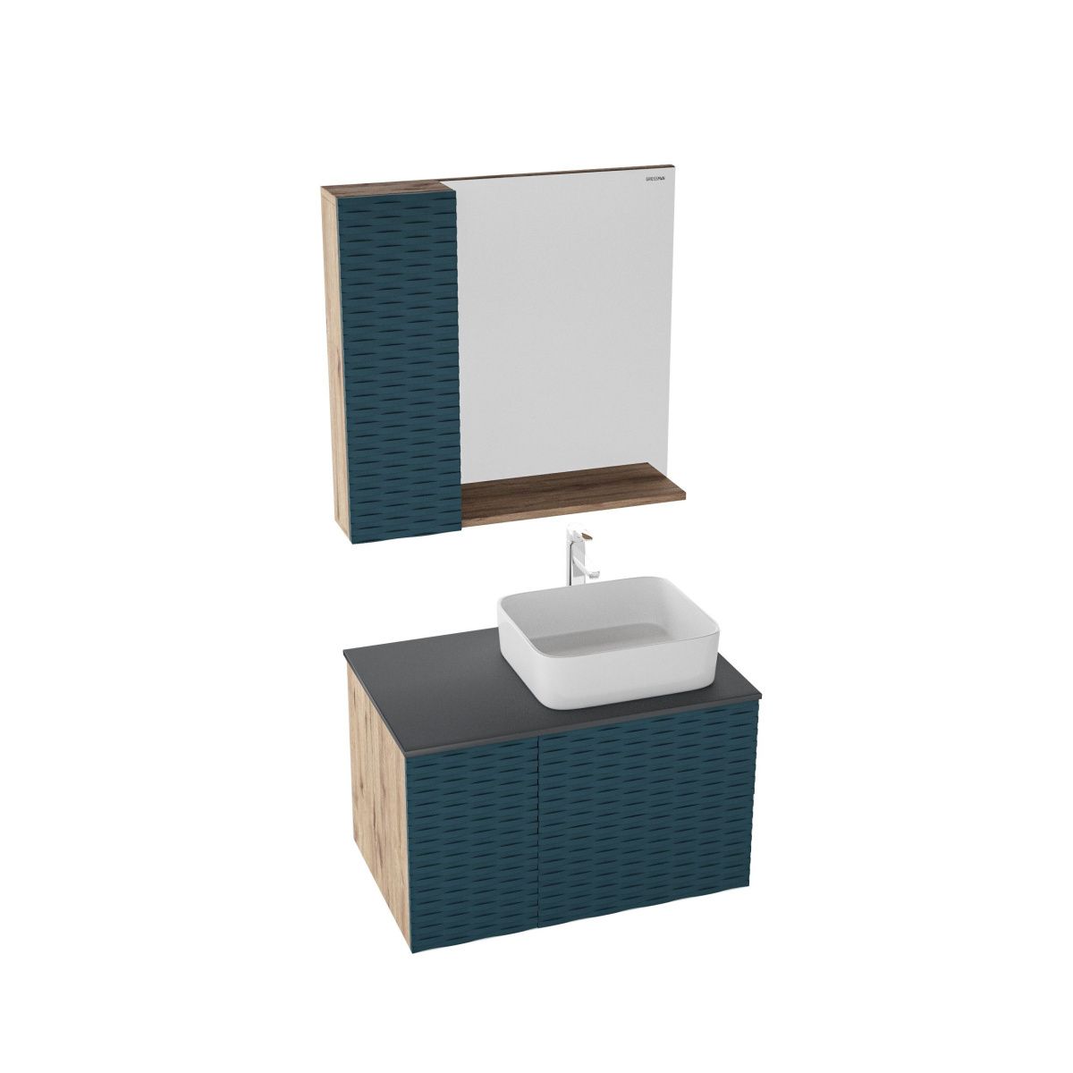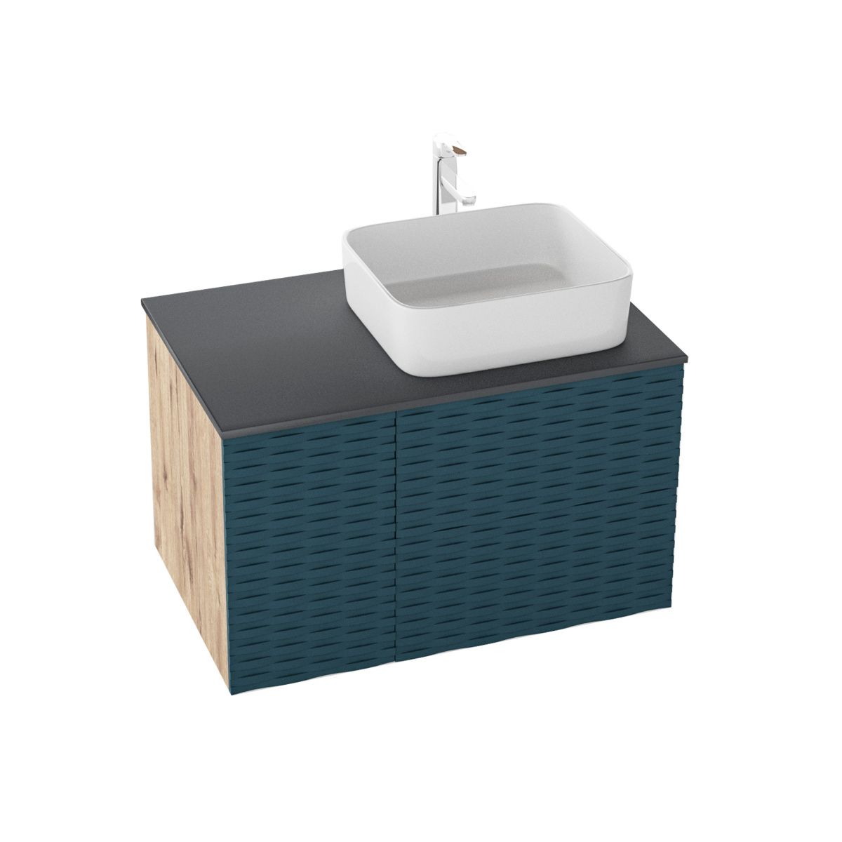 Корпус тумбы выполнен из влагостойкого ЛДСП, фасады ящиков и двери - из МДФ 3D (плетенка) в матовой пленке Soft Touch цвета бриз, столешница из МДФ в матовой пленке в цвете графит устойчивых к  перепадам температур и высокой влажности. Тумба крепится к стене.