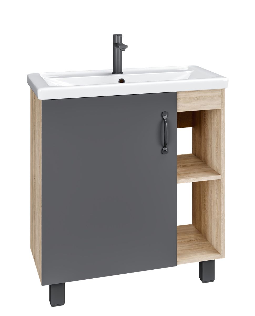Открытые полки справа обеспечивают быстрый доступ к аксессуарам, а пространство за распашной дверцей, снабженной системой плавного закрывания, станет удобным местом для хранения бытовых принадлежностей.