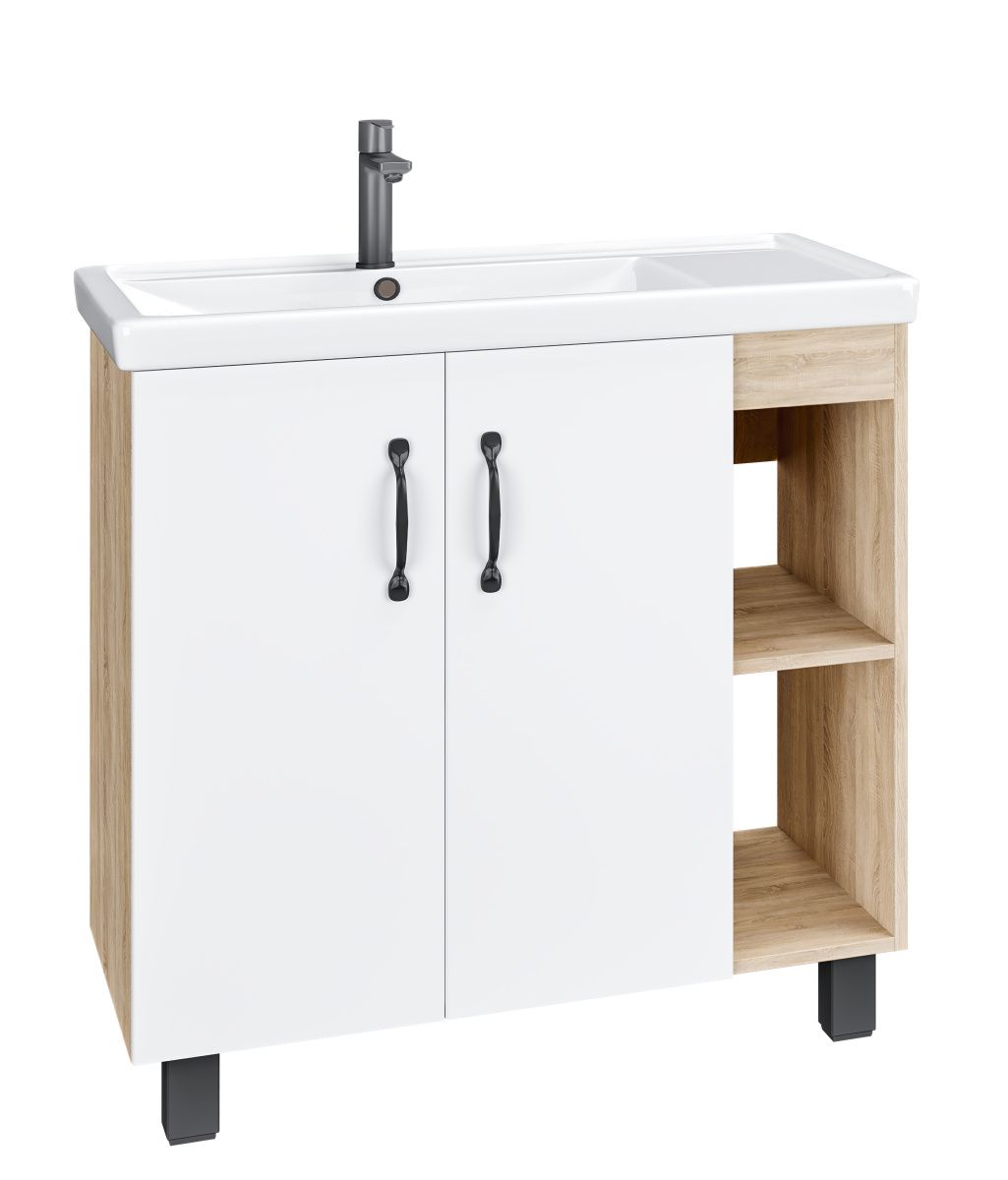 Открытые полки справа обеспечивают быстрый доступ к аксессуарам, а пространство за распашными дверцами, снабженной системой плавного закрывания, станет удобным местом для хранения бытовых принадлежностей.