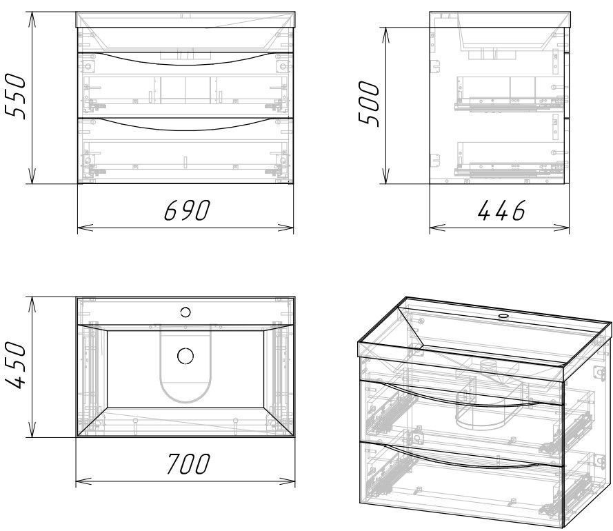Ящики комплектуются шариковыми направляющими скрытого монтажа, с доводчиками. Корпус и фасады тумбы выполнены из влагостойких материалов, устойчивого к перепадам температуры и высокой влажности, крепится к стене и не занимает место на полу. Корпус: ЛДСП бетон пайн; фасады: МДФ, ПВХ- пленка графит матовый. Подвесы для крепления тумбы - в комплекте.