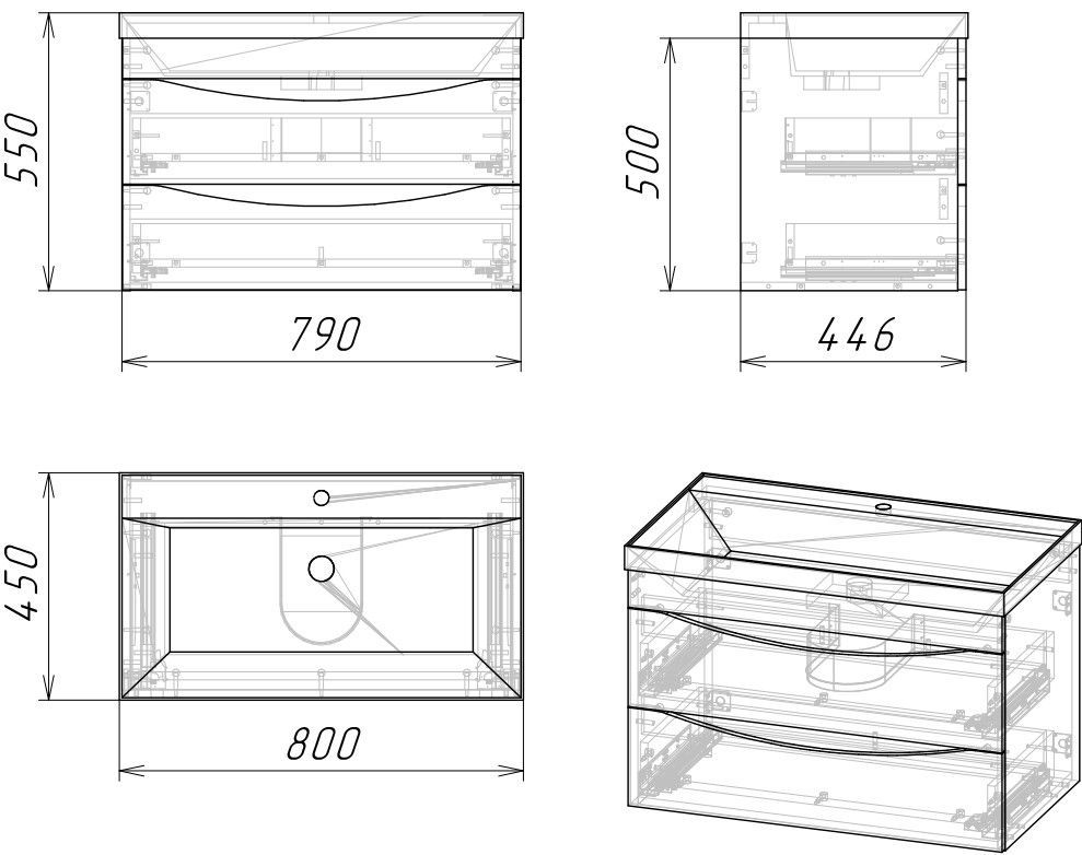 Ящики комплектуются шариковыми направляющими скрытого монтажа, с доводчиками. Корпус и фасады тумбы выполнены из влагостойких материалов, устойчивого к перепадам температуры и высокой влажности, крепится к стене и не занимает место на полу. Корпус: ЛДСП бетон пайн; фасады: МДФ, ПВХ- пленка графит матовый. Подвесы для крепления тумбы - в комплекте.