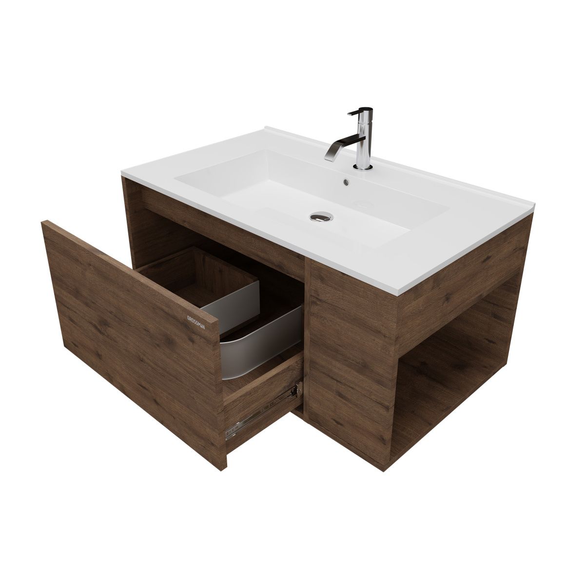 Тумба снабжена одним ящиком, которые укомплектован направляющими плавного закрывания, углубленный ящик предназначены для хранения различных предметов, и открытая ниша справа послужит дополнительным местом для аксессуаров.