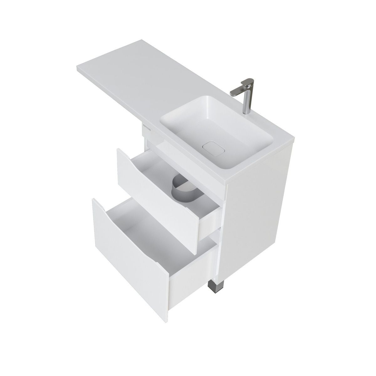 Изготовлена тумба из влагостойкого МДФ, покрытого белой глянцевой краской, устойчивой к перепадам температур и высокой влажности, что делает его идеальным для использования в ванной комнате.