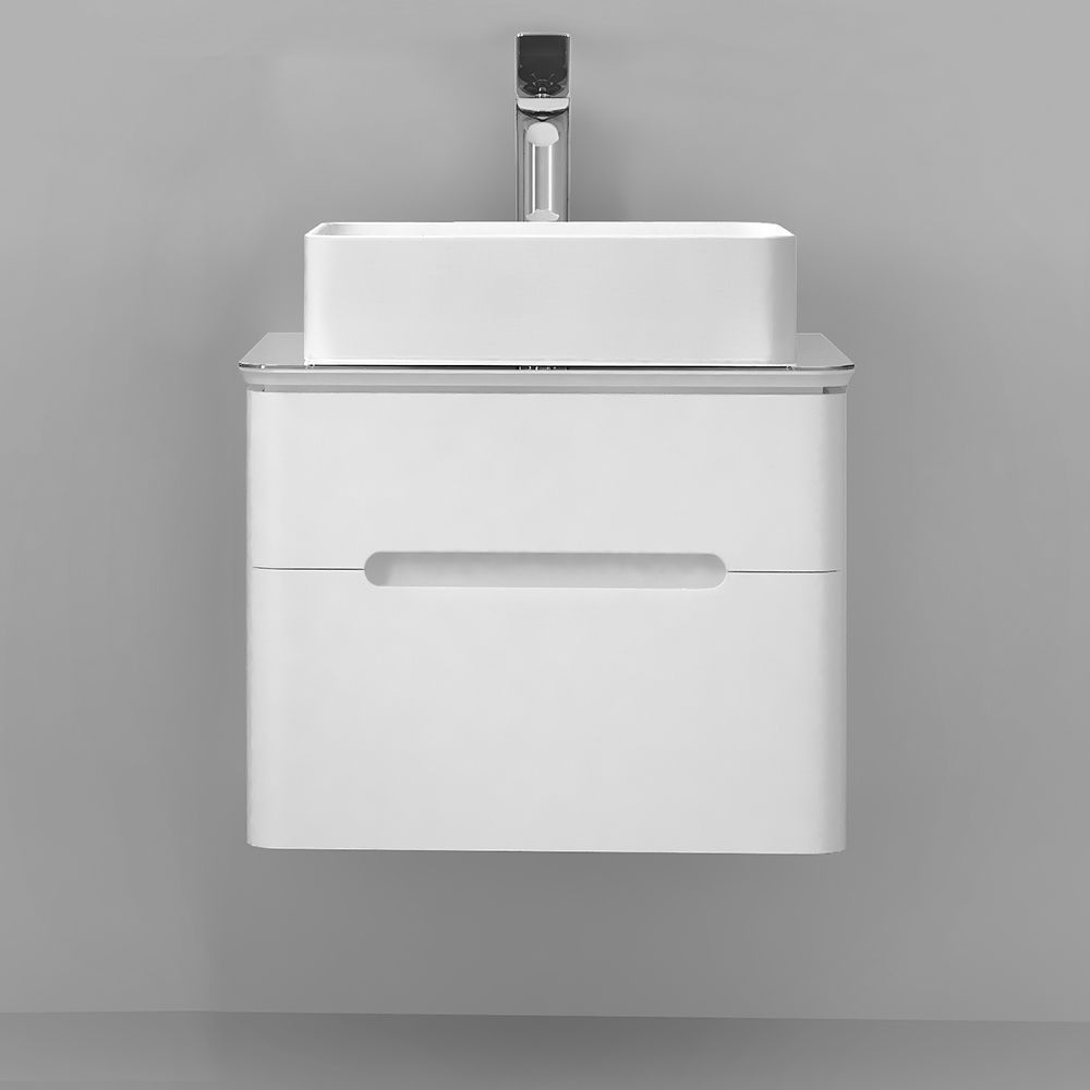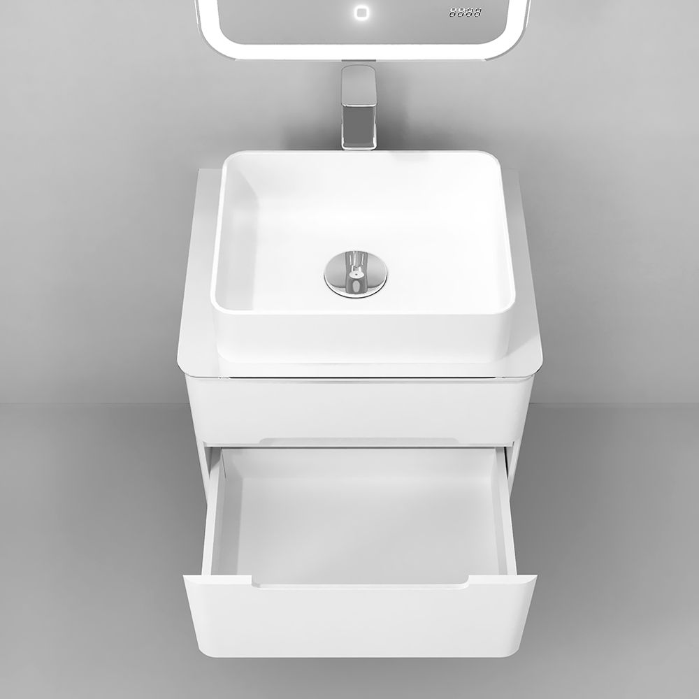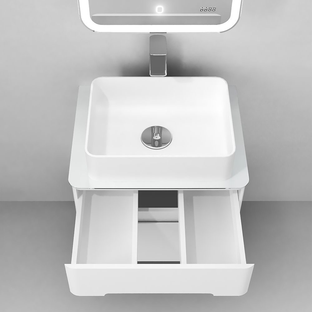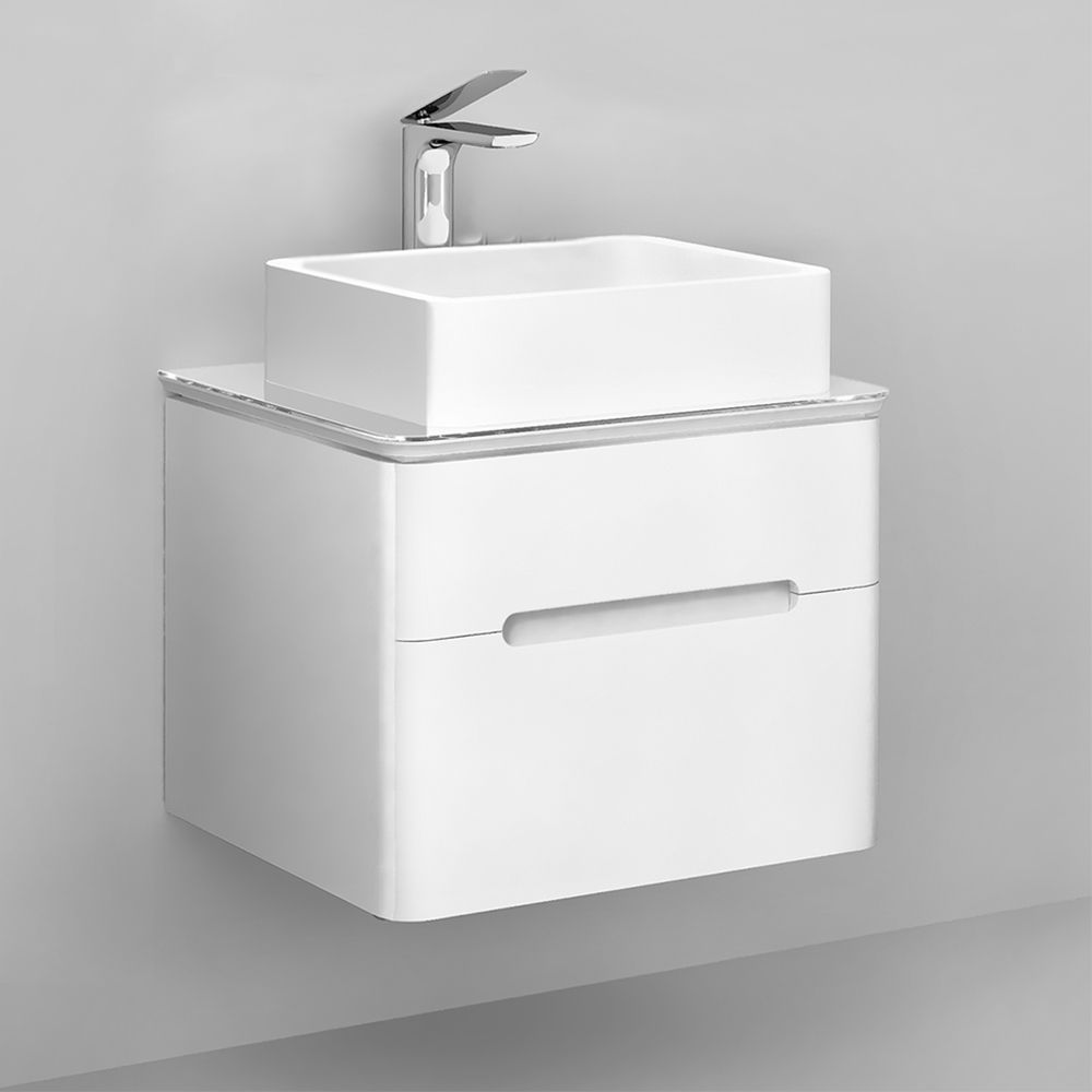 Тумба выполнена  из МДФ в белой глянцевой пленке ПВХ, а столешница из стекла Lacobel. У тумбы 2 вместительных ящика с удобными интегрированными ручками и механизмом плавного закрывания.