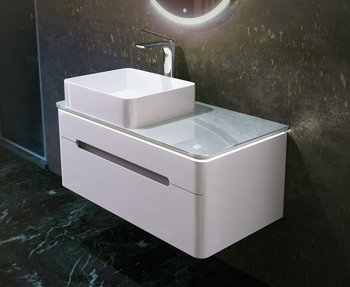 Тумба выполнена полностью из МДФ в белой глянцевой пленке ПВХ, а столешница из стекла Lacobel. Особенностью данной тумбы является подсветка столешницы с сенсорным включателем, которую можно регулировать по степени яркости. У тумбы 2 вместительных ящика с удобными интегрированными ручками и механизмом плавного закрывания.