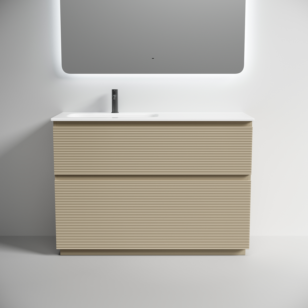 На изображении тумба Folk Floor представлена с зеркалом RAY, смесителем из коллекции ETNA и раковинами Grace CN7020