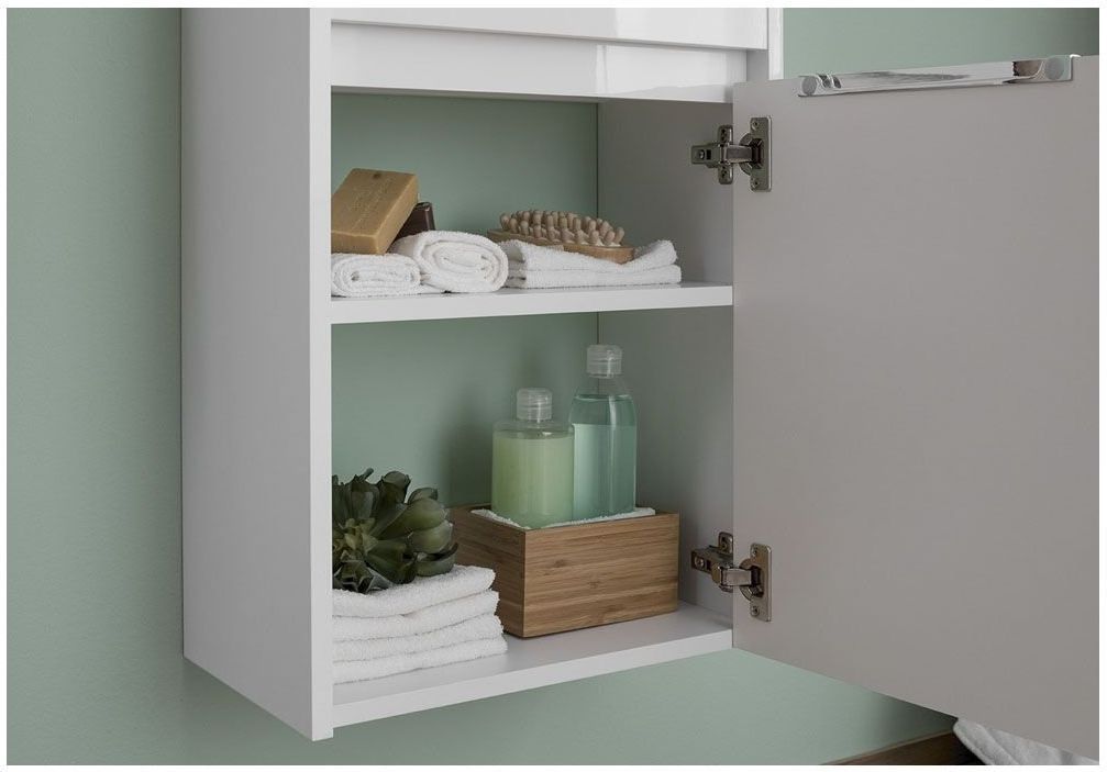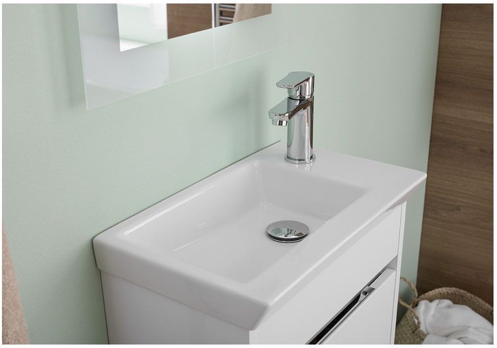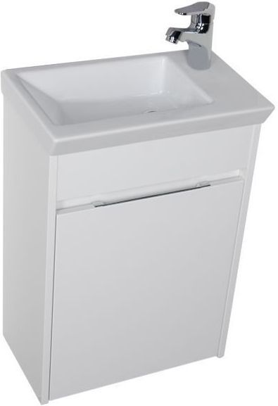 В тумбе предусмотрены просторные полки, а столешницей служит глубокая прямоугольная керамическая раковина. Отверстие под смеситель для удобства расположен по правую руку. <