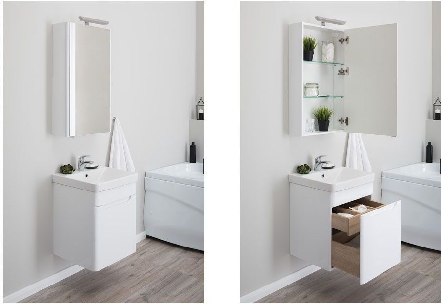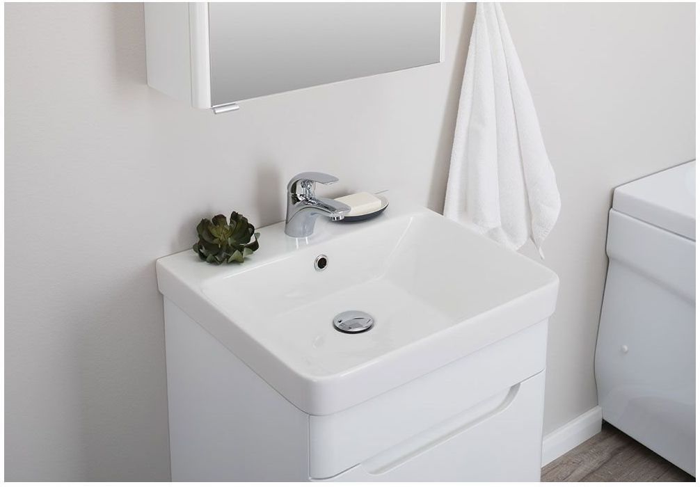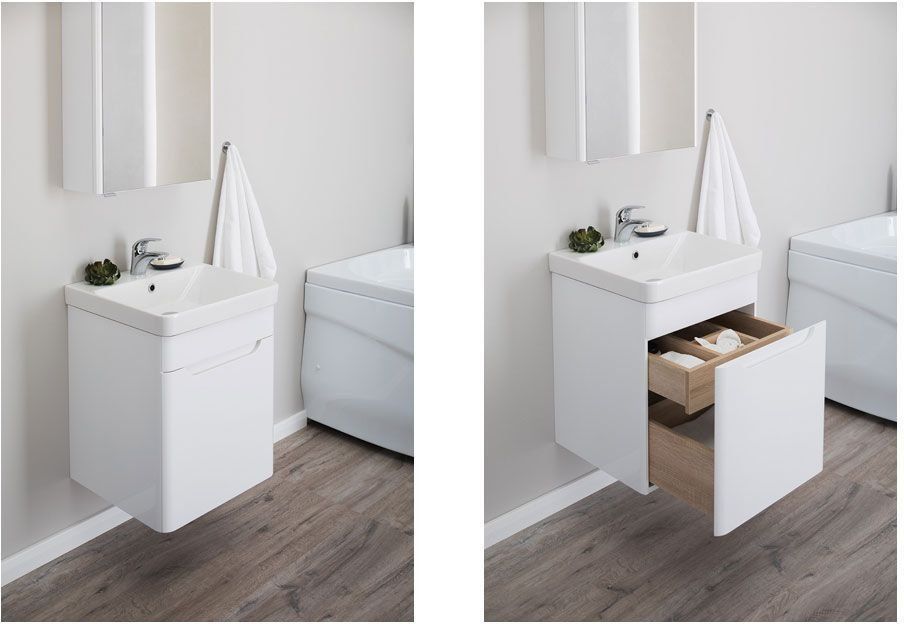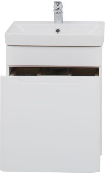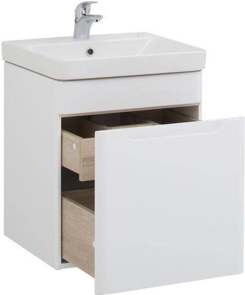 Тумба с раковиной Aquanet София 50 белого цвета состоит из изделий, где все детали продуманы до мелочей. Простая форма прямоугольника - в основе подвесной тумбы, элегантно закругленные углы - для эстетичности и в целях безопасности, керамическая раковина, составляющая внешне единое целое с тумбой, многокомпонентная зона хранения, которая, несомненно, порадует рачительных хозяев. Для исполнения корпуса изделия использован влагостойкий ЛДСП, выкрашенный белой краской, фасады - из МДФ, внутренние ящики - ВЛДСП в цвете дуб сонома. Глянцевые поверхности выглядят безупречно. Конструкция внутреннего устройства тумбы шириной 50 см представляет собой большой выдвижной ящик, внутри которого предусмотрен еще один, небольшой, с тремя отделениями для размещения различных мелочей. Интегрированная ручка удобна в использовании, при этом выглядит элегантно и лаконично. <