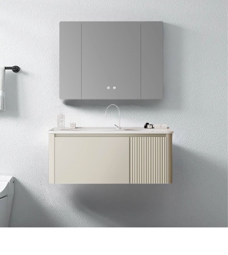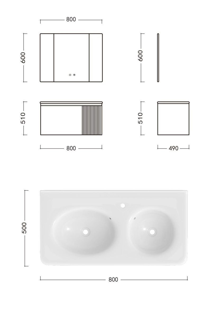 Зеркальный шкаф — 2 дверцы большая и маленькая. 2 внутренние прочные полки из ламинированного ДСП. Петли с плавным закрытием. Подсветка по контуру зеркала с двумя потоками, осуществляемыми нажатием (холодное, теплое освещение), дополнительно функция анти-запотевание, включение сенсорное на передней части зеркала. Основа зеркала — высокопрочный пластик (со встроенными карманами для маленьких предметов, необходимых в ванной комнате).