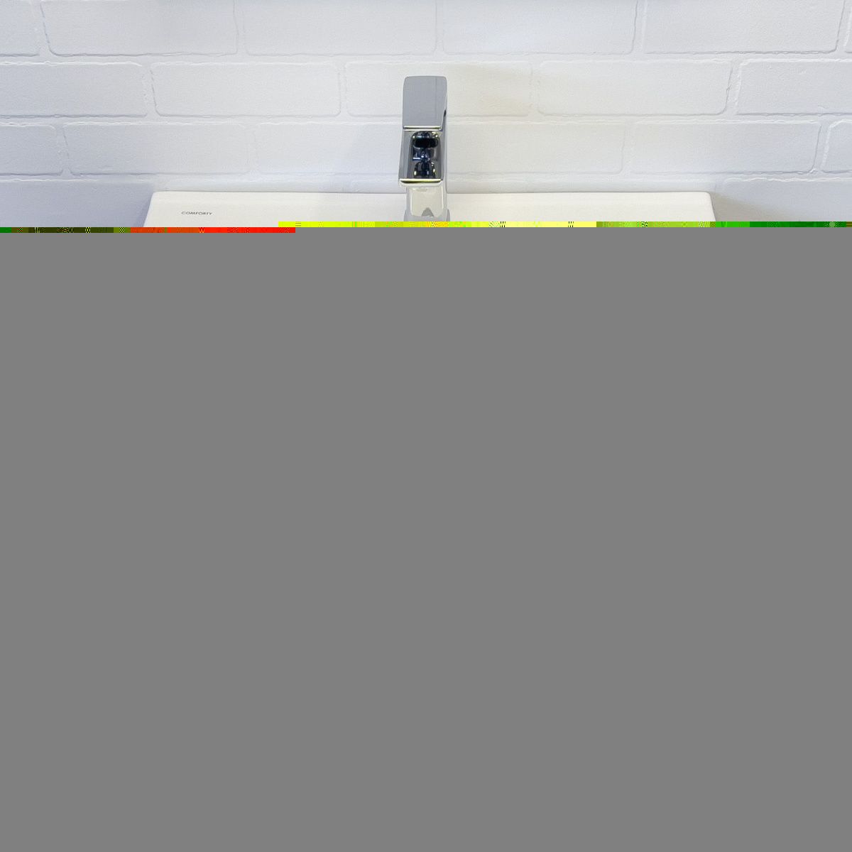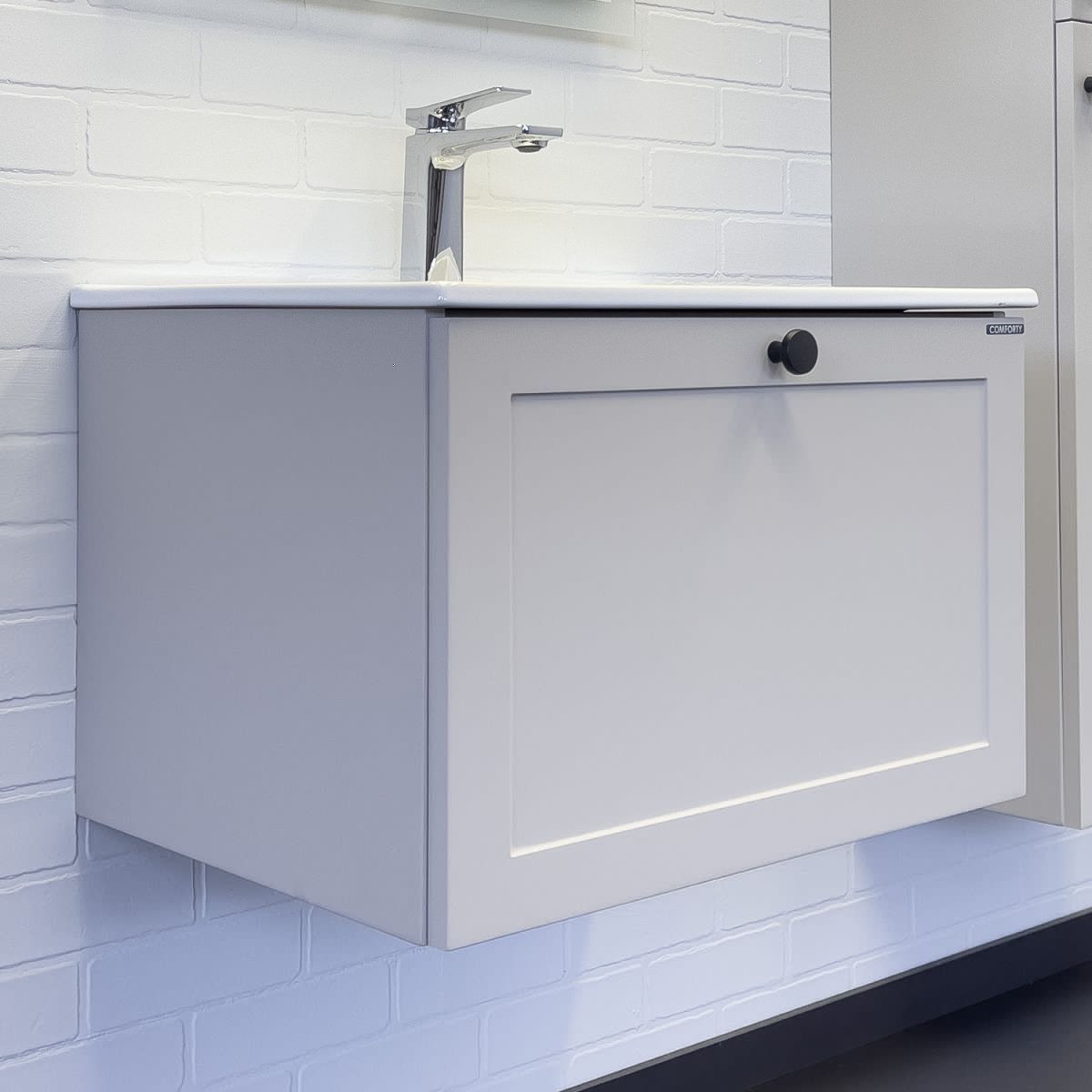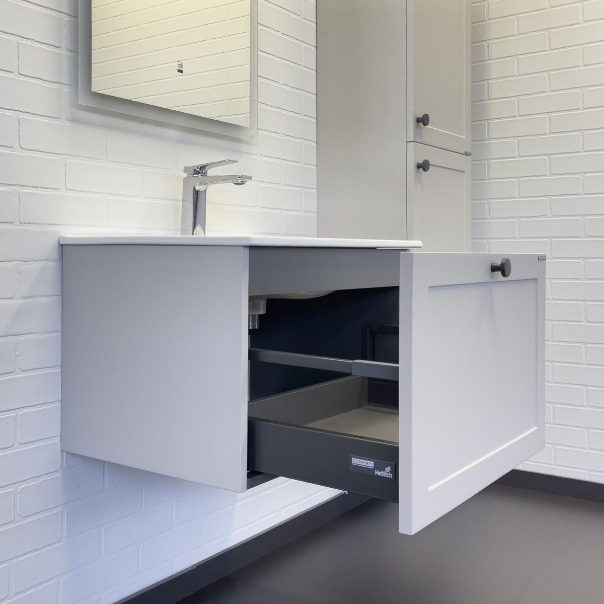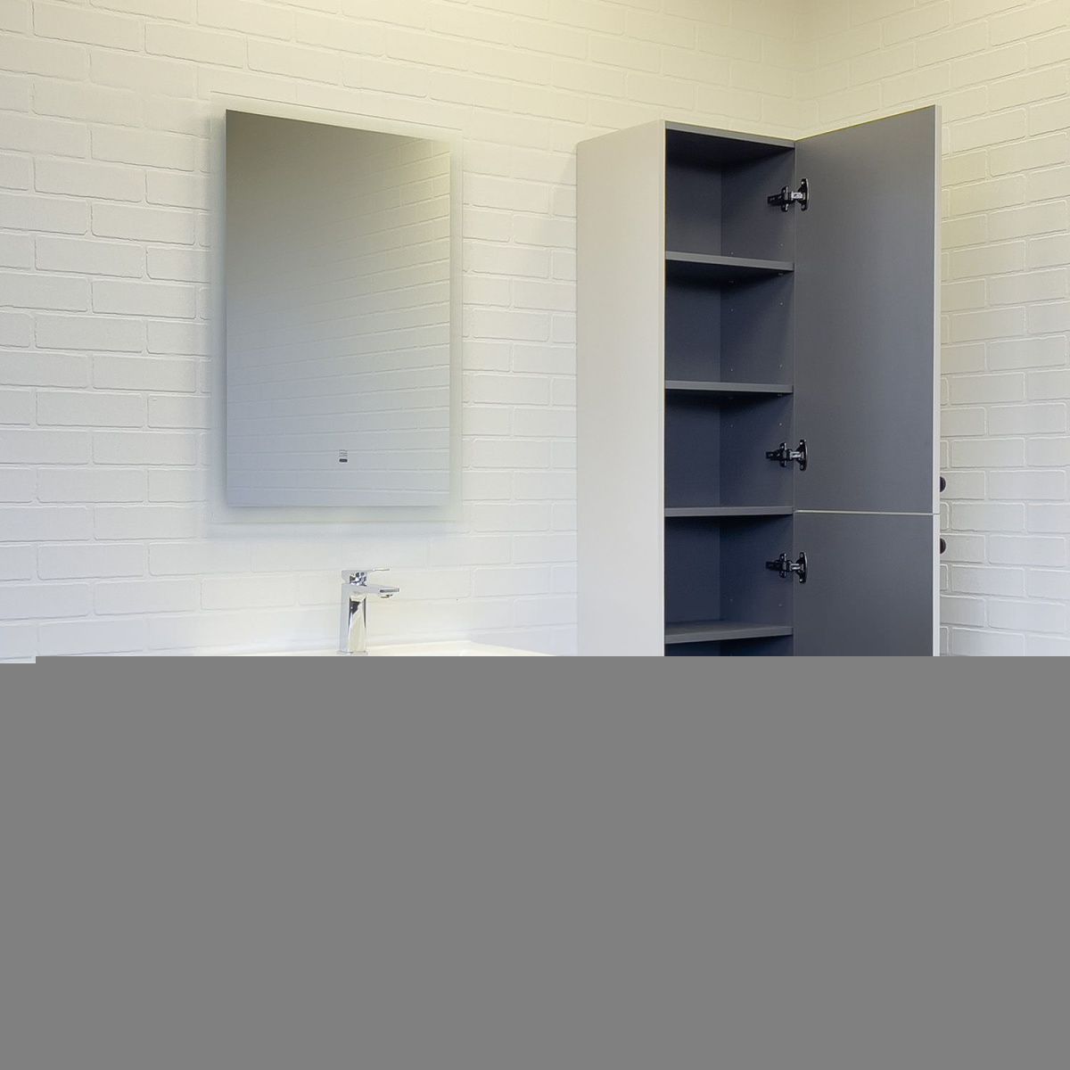 Подвесная тумба с одним выкатным ящиком оборудованным направляющими с системой плавного закрывания. Корпус тумбы изготовлены из влагостойкого ДСП. Фасад тумбы из МДФ фрезерован кантом по периметру. Корпус и фасад тумбы затянуты в матовую пленку цвета "серый шёлк". Тумба подготовлена для подключения водоснабжения снизу и сзади.