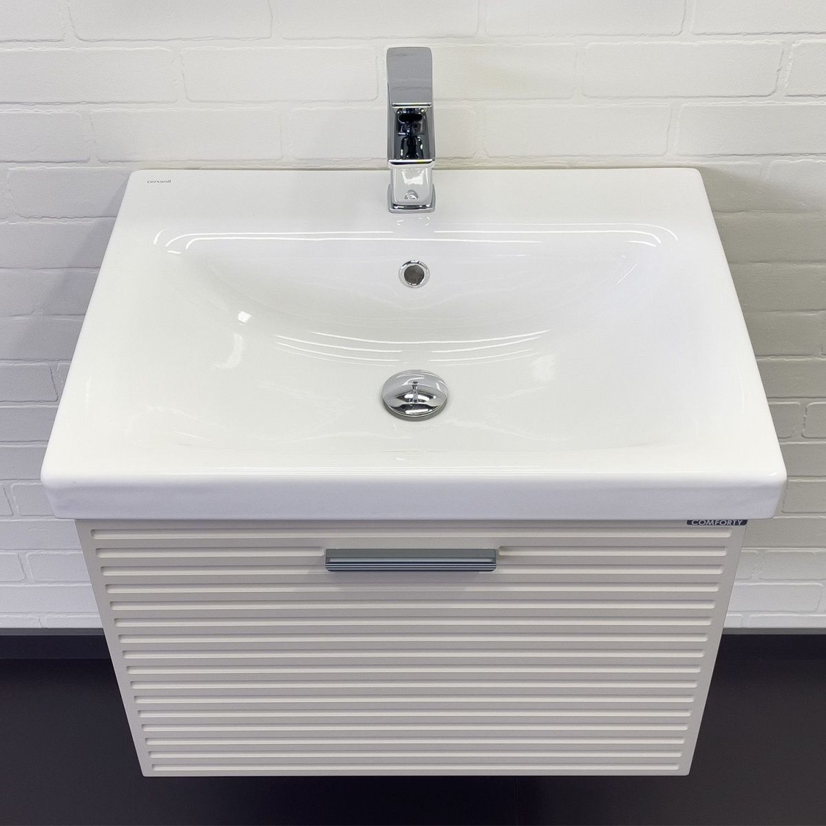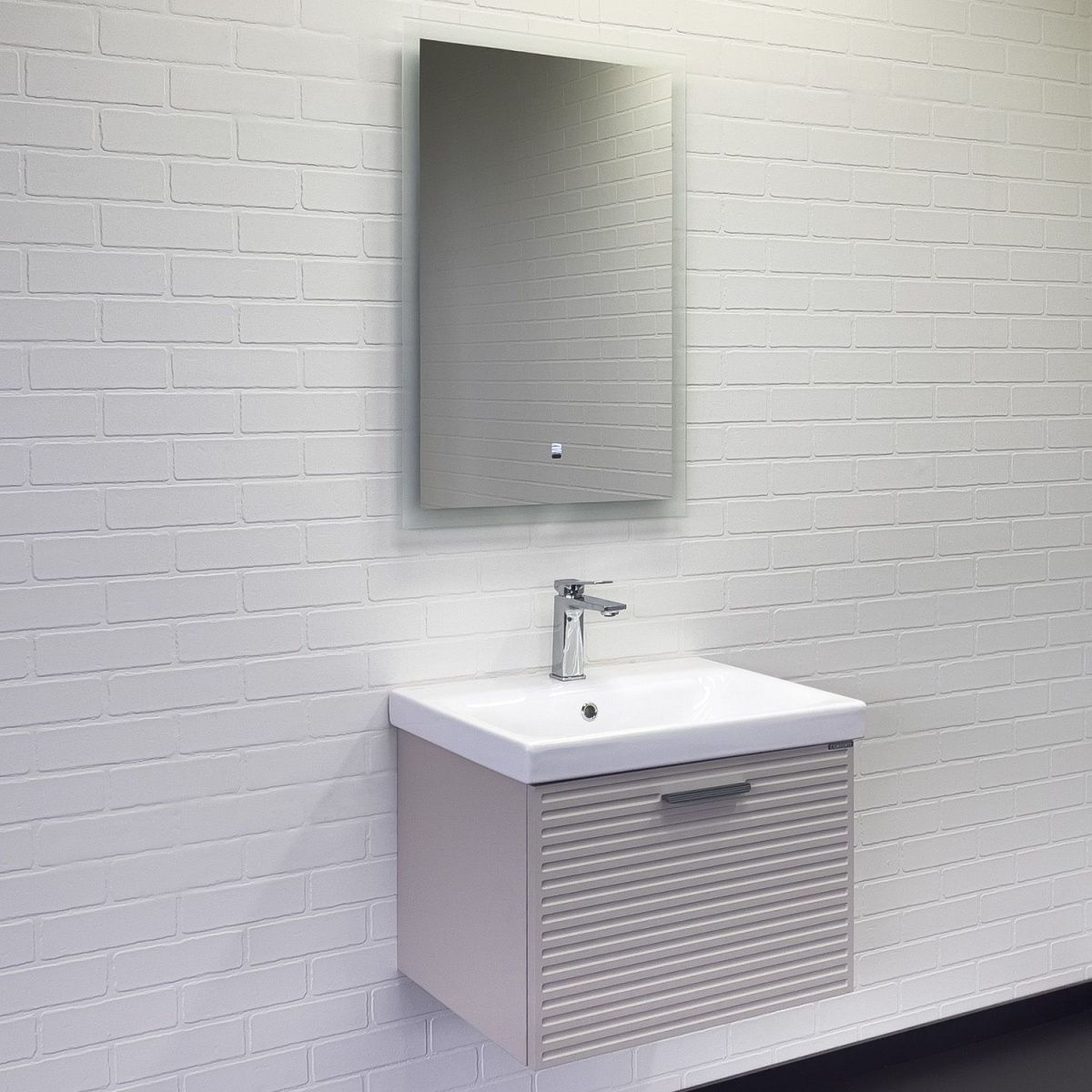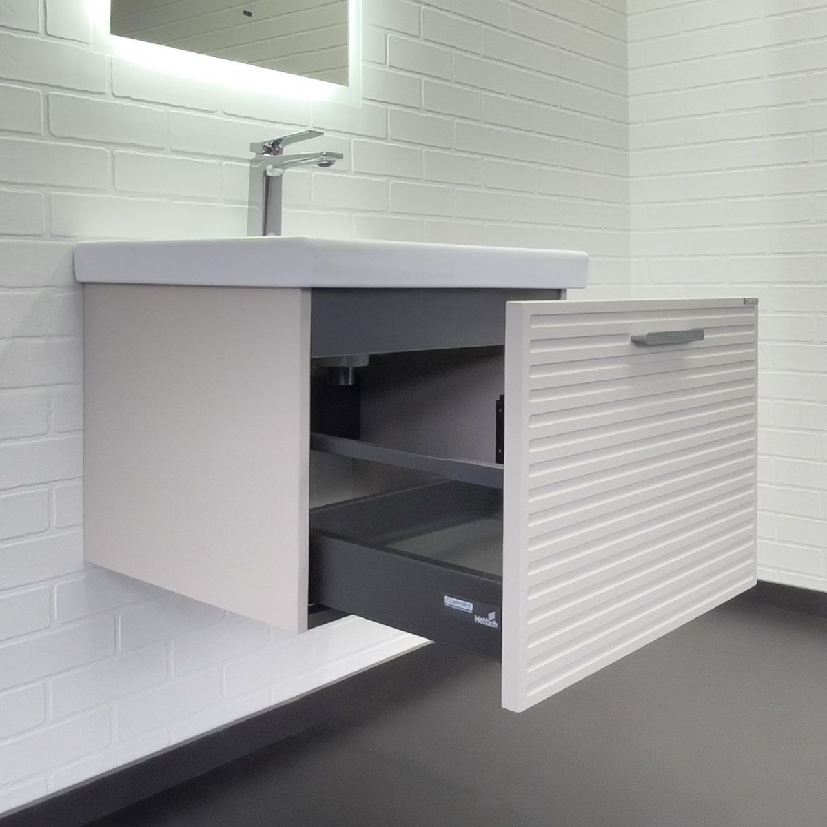 Подвесная тумба с одним выкатным ящиком c направляющими оборудованными системой плавного закрывания. Корпус тумбы изготовлены из влагостойкого ЛДСП. Фасад тумбы из МДФ фрезерован горизонтальным узором и обтянут в пленку цвета "серый шёлк". Тумба подготовлена для подключения водоснабжения снизу и сзади.