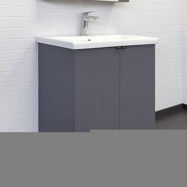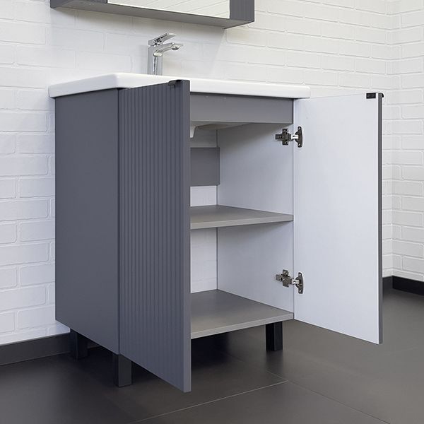Напольная тумба-умывальник с двумя распашными створками декорированными вертикальной фрезеровкой. Створки оснащены петлями плавного закрывания. За створками одна полка. В модели применяется плёнка с эффектом Soft-Touch.