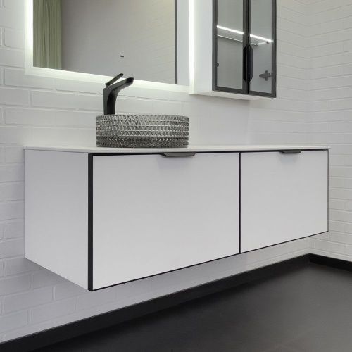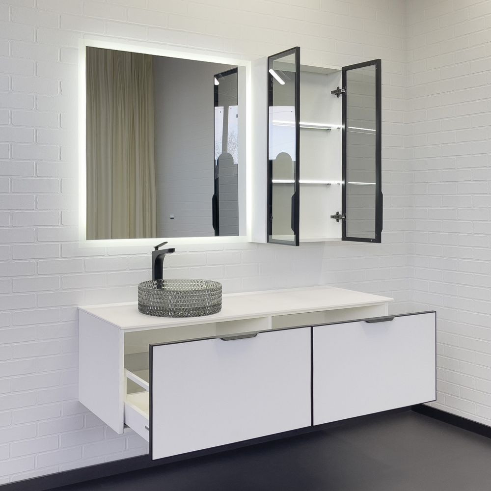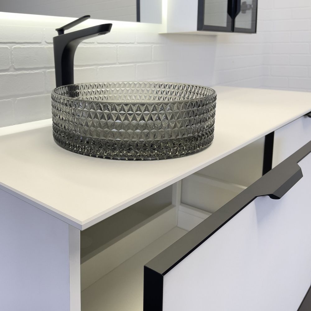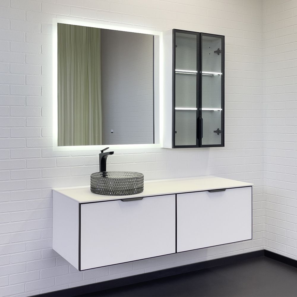 Подвесная тумба-умывальник с двумя выкатными ящиками оборудованными направляющими с механизмами плавного закрывания, столешницей из белой компакт плиты и одной круглой раковиной из закаленного стекла. Фасады ящиков окантованы по периметру в рамки из черного алюминиевого профиля. Верхний профиль с интегрированной ручкой.