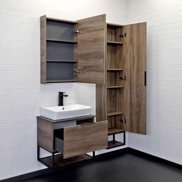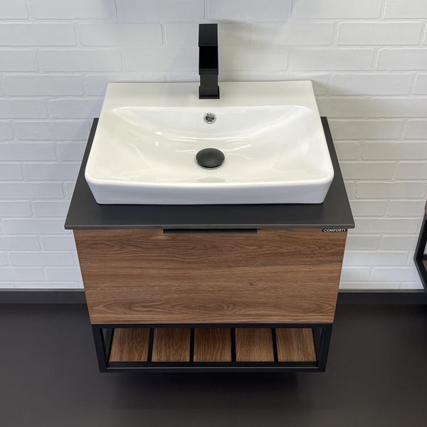 Комплектация: накладная прямоугольная раковина Comforty 9055RA-50, столешница из черного керамогранита. Тумба подготовлена для подключения водоснабжения снизу.