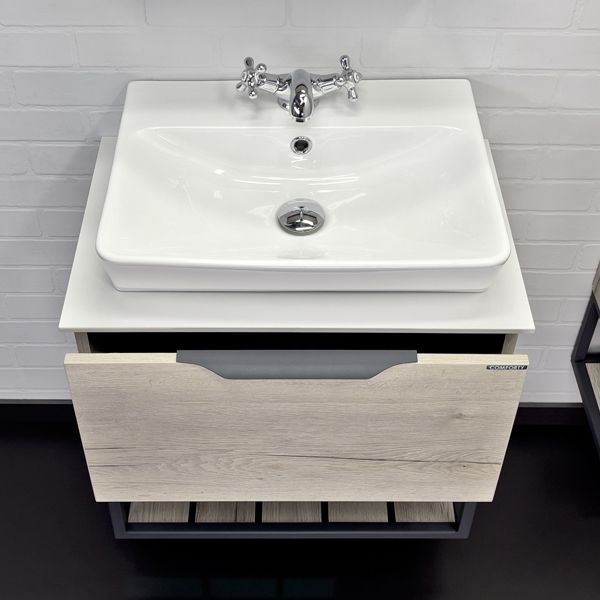 Комплектация: накладная прямоугольная раковина Comforty 9055RA-50, столешница из белого керамогранита. Тумба подготовлена для подключения водоснабжения снизу.