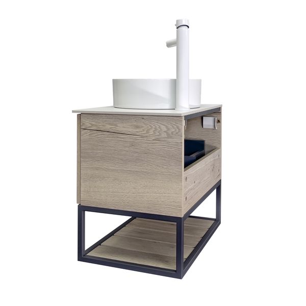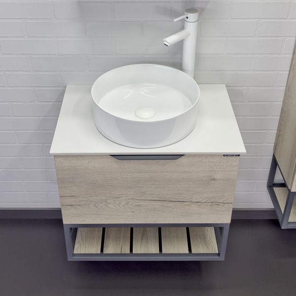 Комплектация: накладная круглая раковина Comforty 9111, столешница из белого керамогранита. Тумба подготовлена для подключения водоснабжения снизу.