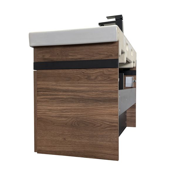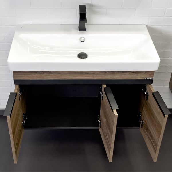 Подвесная тумба-умывальник с широкой прямоугольной чашей. Для сохранения геометрических размеров конструкция тумбы усилена металлической рамой окрашенной в цвет черный муар. Створки оборудованы петлями с механизмами плавного закрывания.