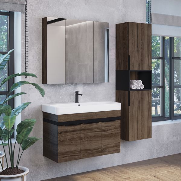 Фасад и корпус тумбы изготовлены из влагостойкого ДСП, созданного по уникальной технологии «Синхронное тиснение» в декоре «дуб темно-коричневый». Этот декор при прикосновении дарит ощущение натуральной древесины.