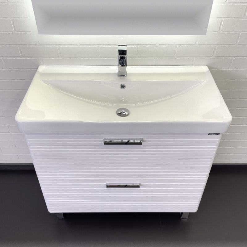 Напольная тумба с двумя выдвижными ящиками оснащенными направляющими с системой плавного закрывания. Оригинальные эргономичные ручки цвета хром. Фасады тумбы изготовлены из МДФ, фрезерованы горизонтальным узором и облицованы белой матовой пленкой. Тумба подготовлена для подключения водоснабжения снизу и сзади.