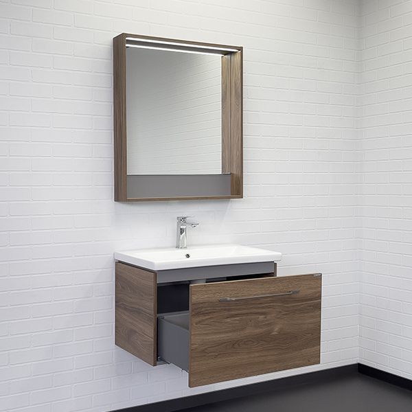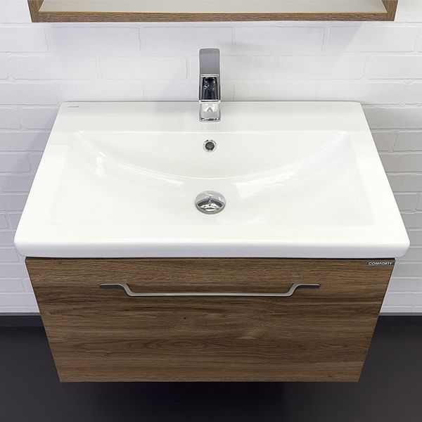 Подвесная тумба с одним большим выдвижным ящиком оборудованным системой плавного закрывания. Корпус тумбы изготовлены из влагостойкого ДСП. Тумба подготовлена для подключения водоснабжения снизу.